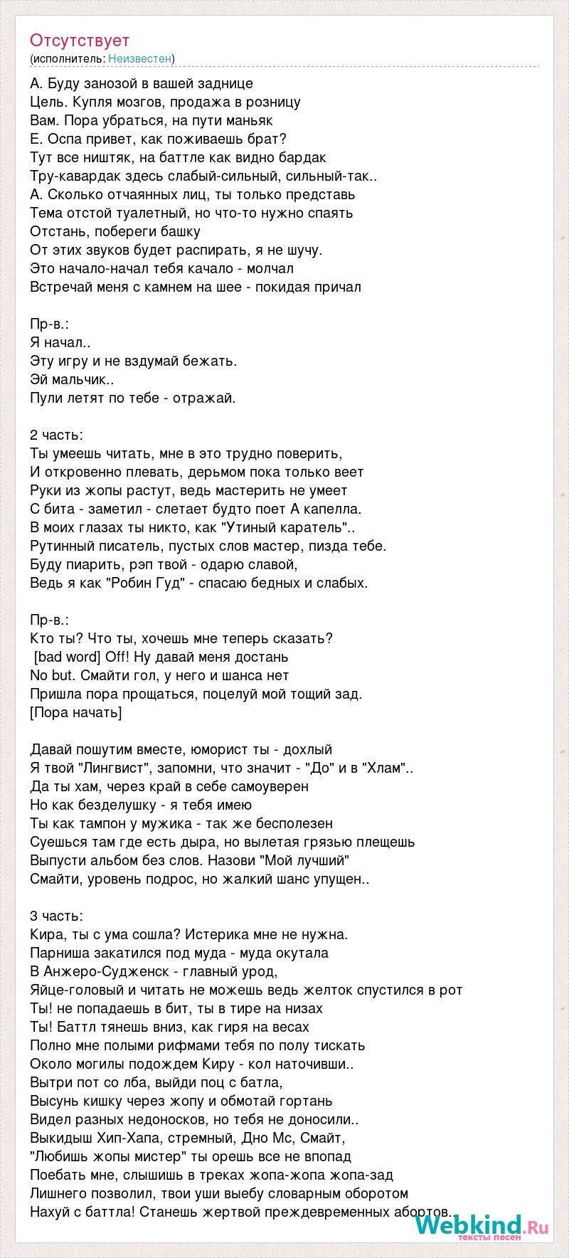 А. Буду занозой в вашей заднице Цель. Купля мозгов, продажа в розницу Вам. Пора убраться, на пути маньяк Е. Оспа привет, как поживаешь брат? Тут все ништяк, на баттле как видно бардак Тру-кавардак здесь слабый-сильный, сильный-так.. А. Сколько отчаянных лиц, ты только представь Тема отстой туалетный, но что-то нужно спаять Отстань, побереги башку От этих звуков будет распирать, я не шучу. Это начало-начал тебя качало - молчал Встречай меня с камнем на шее - покидая причал Пр-в.: Я начал.. Эту игру и не вздумай бежать. Эй мальчик.. Пули летят по тебе - отражай. 2 часть: Ты умеешь читать, мне в это трудно поверить, И откровенно плевать, дерьмом пока только веет Руки из жопы растут, ведь мастерить не умеет С бита - заметил - слетает будто поет А капелла. В моих глазах ты никто, как "Утиный каратель".. Рутинный писатель, пустых слов мастер, пизда тебе. Буду пиарить, рэп твой - одарю славой, Ведь я как "Робин Гуд" - спасаю бедных и слабых. Пр-в.: Кто ты? Что ты, хочешь мне теперь сказать? [bad word] Off! Ну давай меня достань No but. Смайти гол, у него и шанса нет Пришла пора прощаться, поцелуй мой тощий зад. [Пора начать] Давай пошутим вместе, юморист ты - дохлый Я твой "Лингвист", запомни, что значит - "До" и в "Хлам".. Да ты хам, через край в себе самоуверен Но как безделушку - я тебя имею Ты как тампон у мужика - так же бесполезен Суешься там где есть дыра, но вылетая грязью плещешь Выпусти альбом без слов. Назови "Мой лучший" Смайти, уровень подрос, но жалкий шанс упущен.. 3 часть: Кира, ты с ума сошла? Истерика мне не нужна. Парниша закатился под муда - муда окутала В Анжеро-Судженск - главный урод, Яйце-головый и читать не можешь ведь желток спустился в рот Ты! не попадаешь в бит, ты в тире на низах Ты! Баттл тянешь вниз, как гиря на весах Полно мне полыми рифмами тебя по полу тискать Около могилы подождем Киру - кол наточивши.. Вытри пот со лба, выйди поц с батла, Высунь кишку через жопу и обмотай гортань Видел разных недоносков, но тебя не доносили.. Выкидыш Хип-Хапа, стремный, Дно Мс, Смайт, "Любишь жопы мистер" ты орешь все не впопад Поебать мне, слышишь в треках жопа-жопа жопа-зад Лишнего позволил, твои уши выебу словарным оборотом Нахуй с баттла! Станешь жертвой преждевременных абортов..