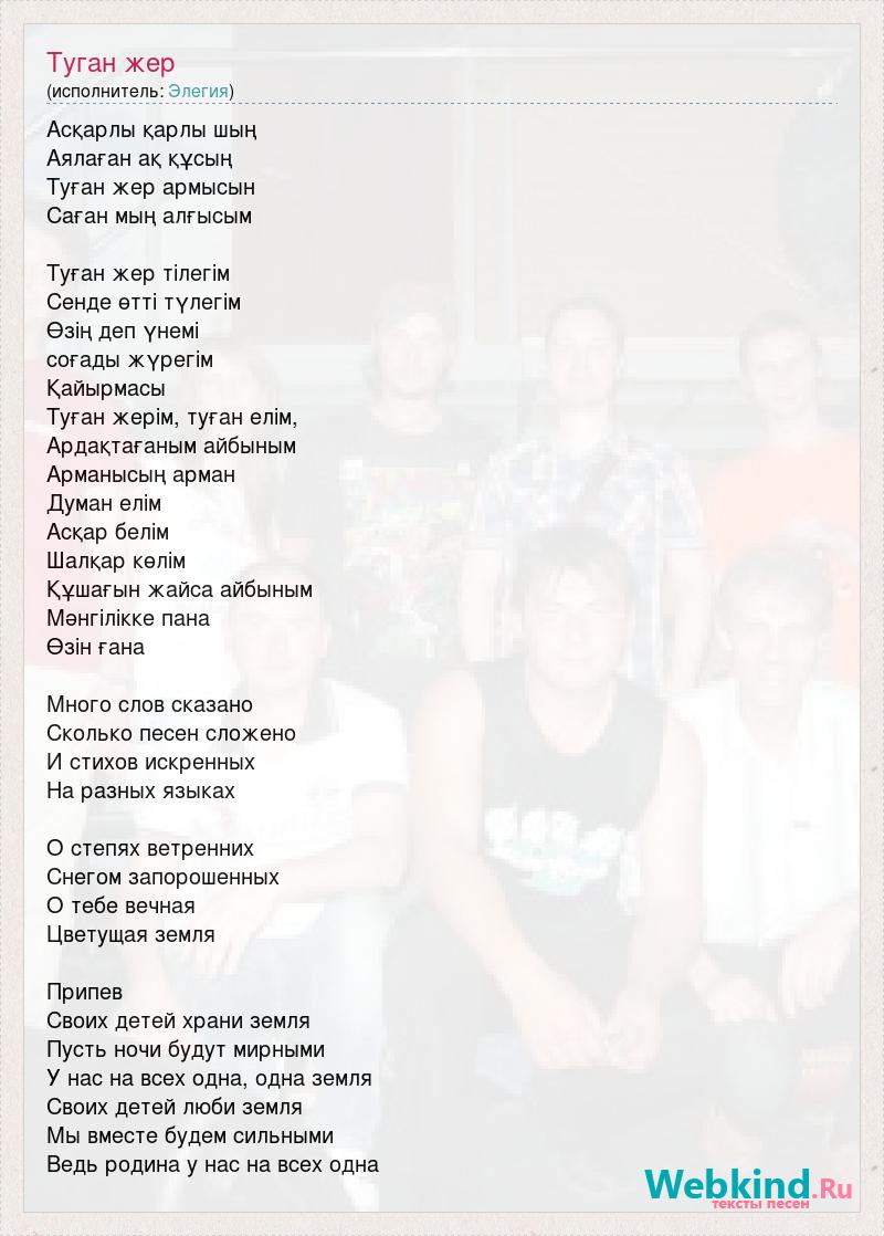Асқарлы қарлы шың Аялаған ақ құсың Туған жер армысын Саған мың алғысым Туған жер тілегім Сенде өтті түлегім Өзің деп үнемі соғады жүрегім Қайырмасы Туған жерім, туған елім, Ардақтағаным айбыным Арманысың арман Думан елім Асқар белім Шалқар көлім Құшағын жайса айбыным Мәнгілікке пана Өзін ғана Много слов сказано Сколько песен сложено И стихов искренных На разных языках О степях ветренних Снегом запорошенных О тебе вечная Цветущая земля Припев Своих детей храни земля Пусть ночи будут мирными У нас на всех одна, одна земля Своих детей люби земля Мы вместе будем сильными Ведь родина у нас на всех одна