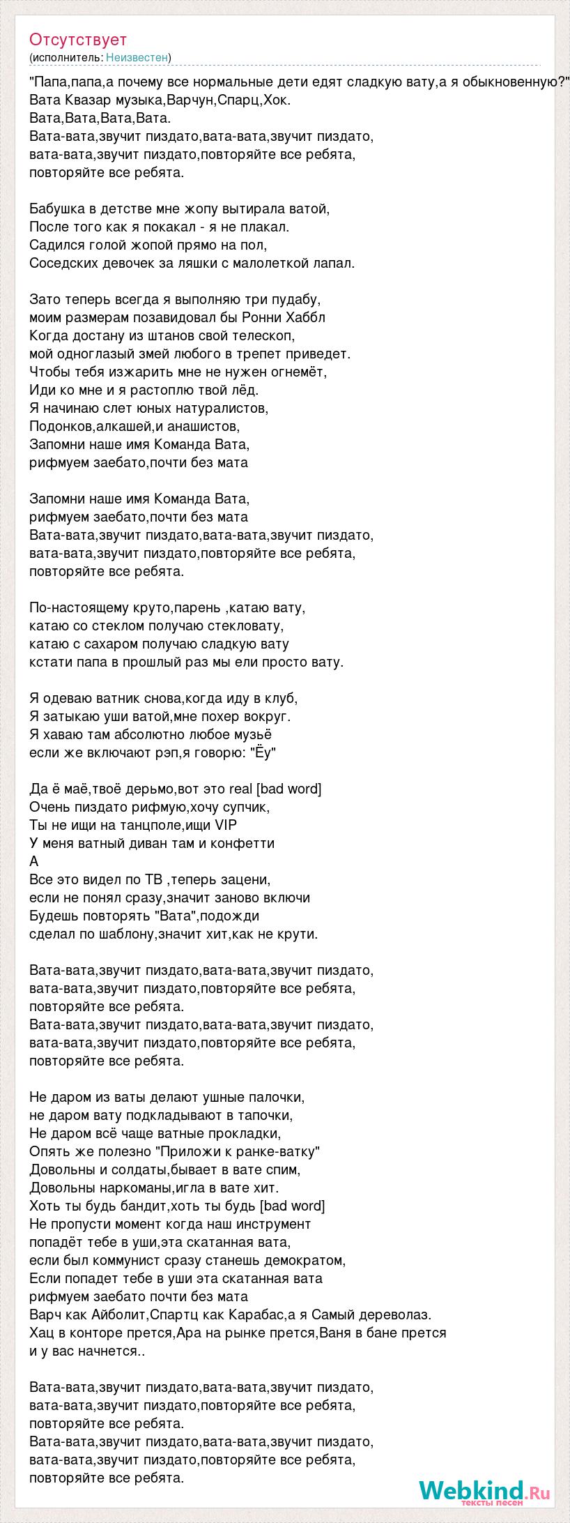 "Папа,папа,а почему все нормальные дети едят сладкую вату,а я обыкновенную?" Вата Квазар музыка,Варчун,Спарц,Хок. Вата,Вата,Вата,Вата. Вата-вата,звучит пиздато,вата-вата,звучит пиздато, вата-вата,звучит пиздато,повторяйте все ребята, повторяйте все ребята. Бабушка в детстве мне жопу вытирала ватой, После того как я покакал - я не плакал. Садился голой жопой прямо на пол, Соседских девочек за ляшки с малолеткой лапал. Зато теперь всегда я выполняю три пудабу, моим размерам позавидовал бы Ронни Хаббл Когда достану из штанов свой телескоп, мой одноглазый змей любого в трепет приведет. Чтобы тебя изжарить мне не нужен огнемёт, Иди ко мне и я растоплю твой лёд. Я начинаю слет юных натуралистов, Подонков,алкашей,и анашистов, Запомни наше имя Команда Вата, рифмуем заебато,почти без мата Запомни наше имя Команда Вата, рифмуем заебато,почти без мата Вата-вата,звучит пиздато,вата-вата,звучит пиздато, вата-вата,звучит пиздато,повторяйте все ребята, повторяйте все ребята. По-настоящему круто,парень ,катаю вату, катаю со стеклом получаю стекловату, катаю с сахаром получаю сладкую вату кстати папа в прошлый раз мы ели просто вату. Я одеваю ватник снова,когда иду в клуб, Я затыкаю уши ватой,мне похер вокруг. Я хаваю там абсолютно любое музьё если же включают рэп,я говорю: "Ёу" Да ё маё,твоё дерьмо,вот это real [bad word] Очень пиздато рифмую,хочу супчик, Ты не ищи на танцполе,ищи VIP У меня ватный диван там и конфетти А Все это видел по ТВ ,теперь зацени, если не понял сразу,значит заново включи Будешь повторять "Вата",подожди сделал по шаблону,значит хит,как не крути. Вата-вата,звучит пиздато,вата-вата,звучит пиздато, вата-вата,звучит пиздато,повторяйте все ребята, повторяйте все ребята. Вата-вата,звучит пиздато,вата-вата,звучит пиздато, вата-вата,звучит пиздато,повторяйте все ребята, повторяйте все ребята. Не даром из ваты делают ушные палочки, не даром вату подкладывают в тапочки, Не даром всё чаще ватные прокладки, Опять же полезно "Приложи к ранке-ватку" Довольны и солдаты,бывает в вате спим, Довольны наркоманы,игла в вате хит. Хоть ты будь бандит,хоть ты будь [bad word] Не пропусти момент когда наш инструмент попадёт тебе в уши,эта скатанная вата, если был коммунист сразу станешь демократом, Если попадет тебе в уши эта скатанная вата рифмуем заебато почти без мата Варч как Айболит,Спартц как Карабас,а я Самый дереволаз. Хац в конторе прется,Ара на рынке прется,Ваня в бане прется и у вас начнется.. Вата-вата,звучит пиздато,вата-вата,звучит пиздато, вата-вата,звучит пиздато,повторяйте все ребята, повторяйте все ребята. Вата-вата,звучит пиздато,вата-вата,звучит пиздато, вата-вата,звучит пиздато,повторяйте все ребята, повторяйте все ребята.