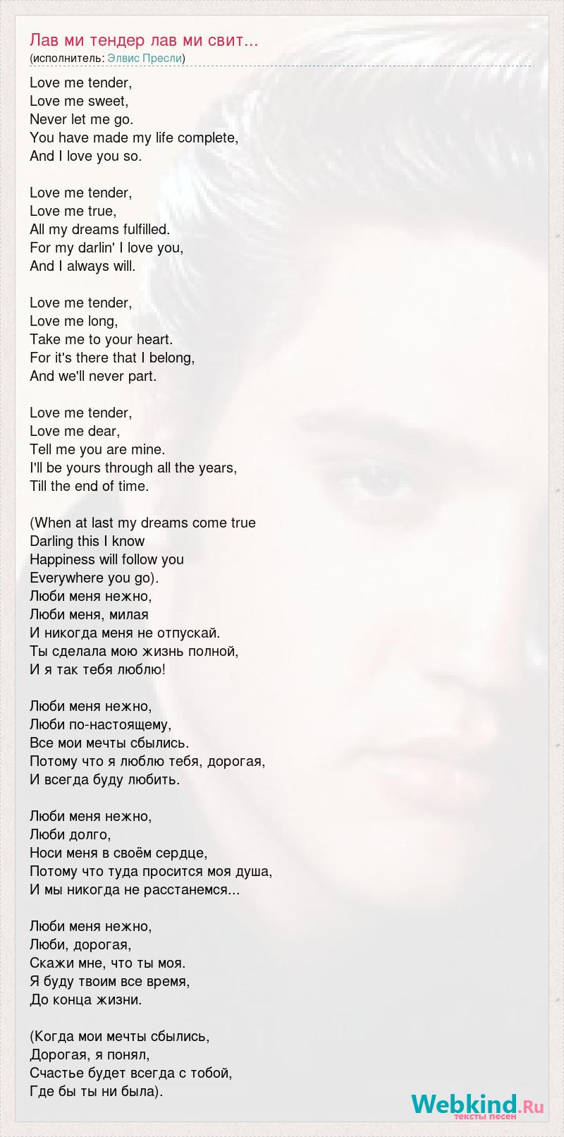 Love me tender, Love me sweet, Never let me go. You have made my life complete, And I love you so. Love me tender, Love me true, All my dreams fulfilled. For my darlin' I love you, And I always will. Love me tender, Love me long, Take me to your heart. For it's there that I belong, And we'll never part. Love me tender, Love me dear, Tell me you are mine. I'll be yours through all the years, Till the end of time. (When at last my dreams come true Darling this I know Happiness will follow you Everywhere you go). Люби меня нежно, Люби меня, милая И никогда меня не отпускай. Ты сделала мою жизнь полной, И я так тебя люблю! Люби меня нежно, Люби по-настоящему, Все мои мечты сбылись. Потому что я люблю тебя, дорогая, И всегда буду любить. Люби меня нежно, Люби долго, Носи меня в своём сердце, Потому что туда просится моя душа, И мы никогда не расстанемся... Люби меня нежно, Люби, дорогая, Скажи мне, что ты моя. Я буду твоим все время, До конца жизни. (Когда мои мечты сбылись, Дорогая, я понял, Счастье будет всегда с тобой, Где бы ты ни была).