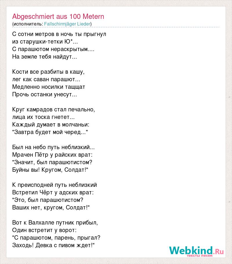 С сотни метров в ночь ты прыгнул из старушки-тетки Ю*... С парашютом нераскрытым.... На земле тебя найдут... Кости все разбиты в кашу, лег как саван парашют... Медленно носилки тащщат Прочь останки унесут... Круг камрадов стал печально, лица их тоска гнетет... Каждый думает в молчаньи: "Завтра будет мой черед..." Был на небо путь неблизкий... Мрачен Пётр у райских врат: "Значит, был парашютистом? Буйны вы! Кругом, Солдат!" К преисподней путь неблизкий Встретил Чёрт у адских врат: "Это, был парашютистом? Ваших нет, кругом, Солдат!" Вот к Валхалле путник прибыл, Один встретит у ворот: "С парашютом, парень, прыгал? Заходь! Девка с пивом ждет!"