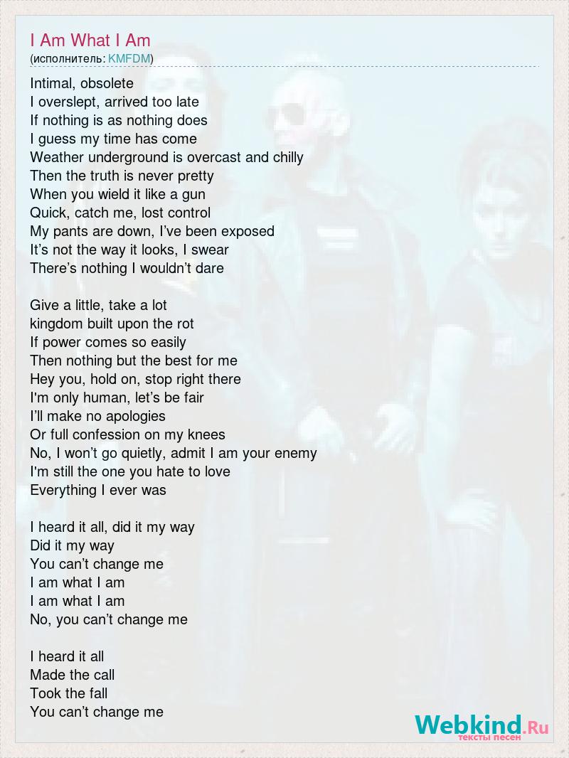 Intimal, obsolete I overslept, arrived too late If nothing is as nothing does I guess my time has come Weather underground is overcast and chilly Then the truth is never pretty When you wield it like a gun Quick, catch me, lost control My pants are down, I’ve been exposed It’s not the way it looks, I swear There’s nothing I wouldn’t dare Give a little, take a lot kingdom built upon the rot If power comes so easily Then nothing but the best for me Hey you, hold on, stop right there I'm only human, let’s be fair I’ll make no apologies Or full confession on my knees No, I won’t go quietly, admit I am your enemy I'm still the one you hate to love Everything I ever was I heard it all, did it my way Did it my way You can’t change me I am what I am I am what I am No, you can’t change me I heard it all Made the call Took the fall You can’t change me