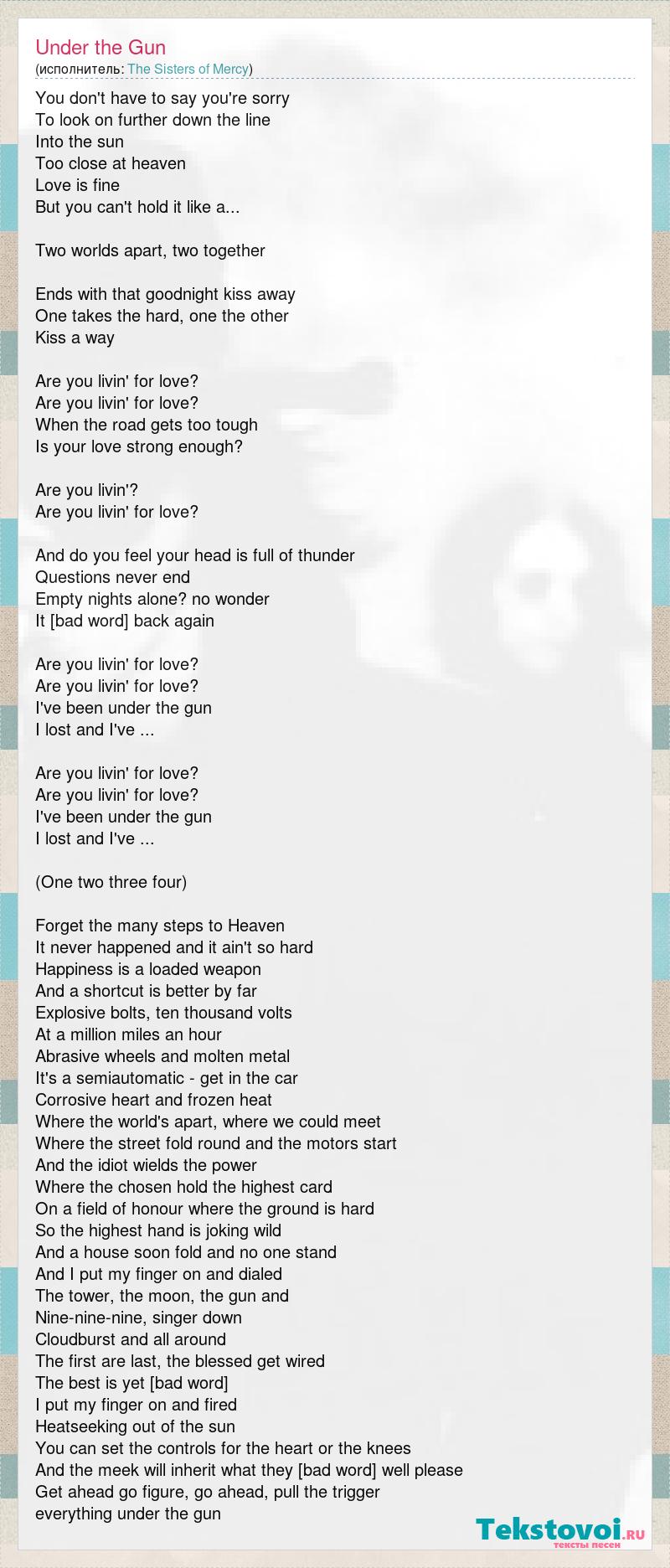 You don't have to say you're sorry To look on further down the line Into the sun Too close at heaven Love is fine But you can't hold it like a... Two worlds apart, two together Ends with that goodnight kiss away One takes the hard, one the other Kiss a way Are you livin' for love? Are you livin' for love? When the road gets too tough Is your love strong enough? Are you livin'? Are you livin' for love? And do you feel your head is full of thunder Questions never end Empty nights alone? no wonder It [bad word] back again Are you livin' for love? Are you livin' for love? I've been under the gun I lost and I've ... Are you livin' for love? Are you livin' for love? I've been under the gun I lost and I've ... (One two three four) Forget the many steps to Heaven It never happened and it ain't so hard Happiness is a loaded weapon And a shortcut is better by far Explosive bolts, ten thousand volts At a million miles an hour Abrasive wheels and molten metal It's a semiautomatic - get in the car Corrosive heart and frozen heat Where the world's apart, where we could meet Where the street fold round and the motors start And the idiot wields the power Where the chosen hold the highest card On a field of honour where the ground is hard So the highest hand is joking wild And a house soon fold and no one stand And I put my finger on and dialed The tower, the moon, the gun and Nine-nine-nine, singer down Cloudburst and all around The first are last, the blessed get wired The best is yet [bad word] I put my finger on and fired Heatseeking out of the sun You can set the controls for the heart or the knees And the meek will inherit what they [bad word] well please Get ahead go figure, go ahead, pull the trigger everything under the gun
