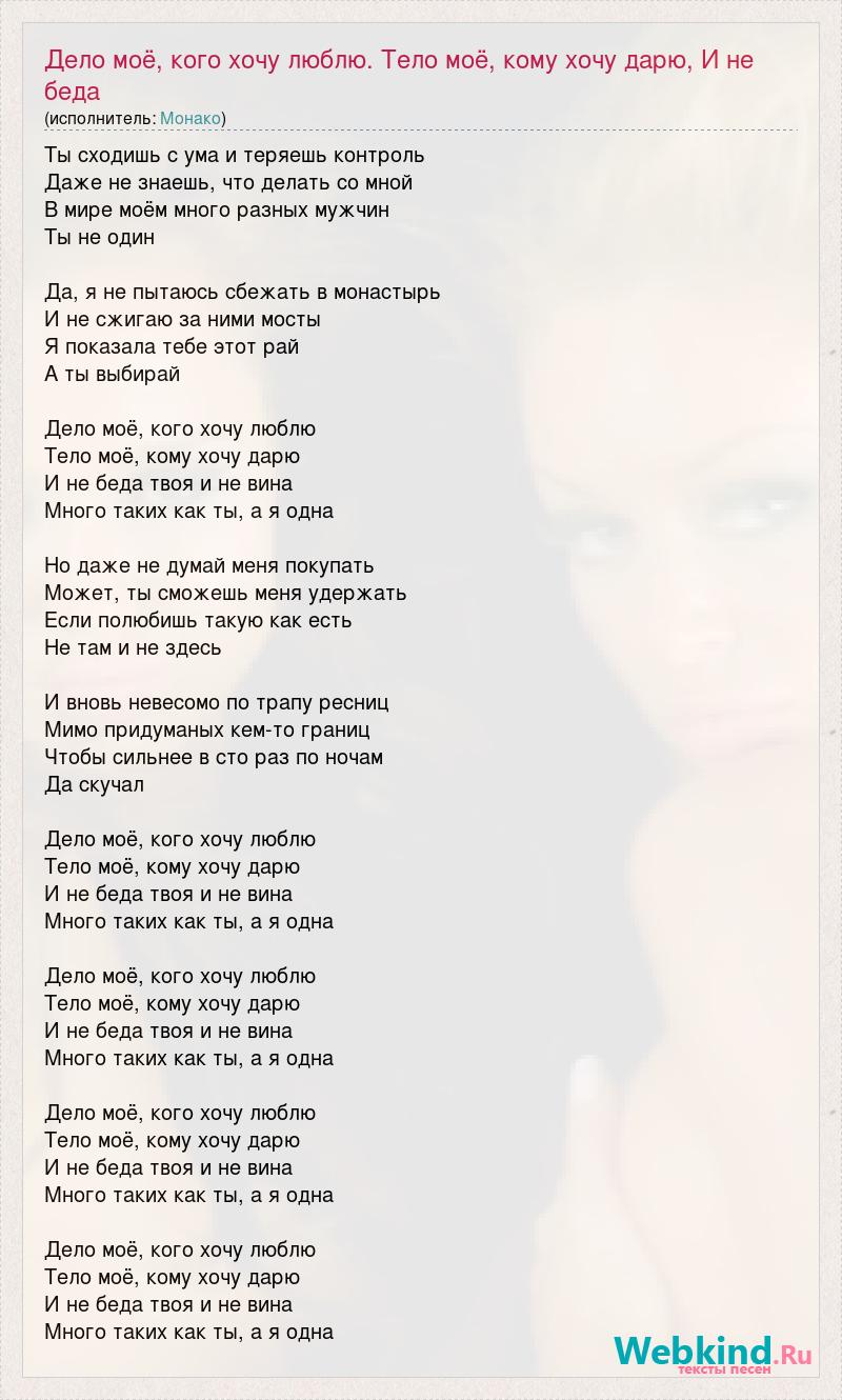 Дело моё, кого хочу люблю. Тело моё, кому хочу дарю, И не беда твоя и