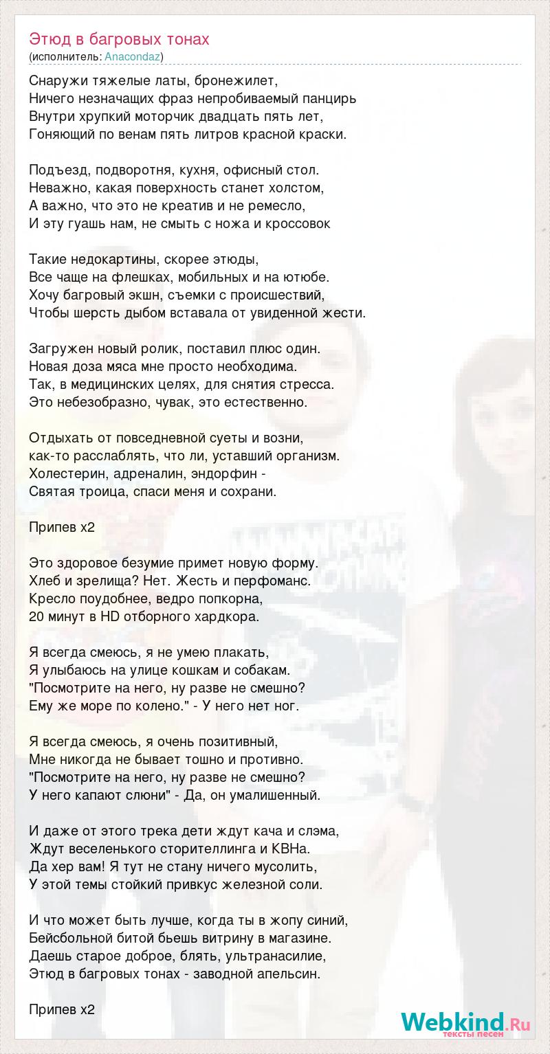 Снаружи тяжелые латы, бронежилет, Ничего незначащих фраз непробиваемый панцирь Внутри хрупкий моторчик двадцать пять лет, Гоняющий по венам пять литров красной краски. Подъезд, подворотня, кухня, офисный стол. Неважно, какая поверхность станет холстом, А важно, что это не креатив и не ремесло, И эту гуашь нам, не смыть с ножа и кроссовок Такие недокартины, скорее этюды, Все чаще на флешках, мобильных и на ютюбе. Хочу багровый экшн, съемки с происшествий, Чтобы шерсть дыбом вставала от увиденной жести. Загружен новый ролик, поставил плюс один. Новая доза мяса мне просто необходима. Так, в медицинских целях, для снятия стресса. Это небезобразно, чувак, это естественно. Отдыхать от повседневной суеты и возни, как-то расслаблять, что ли, уставший организм. Холестерин, адреналин, эндорфин - Святая троица, спаси меня и сохрани. Припев x2 Это здоровое безумие примет новую форму. Хлеб и зрелища? Нет. Жесть и перфоманс. Кресло поудобнее, ведро попкорна, 20 минут в HD отборного хардкора. Я всегда смеюсь, я не умею плакать, Я улыбаюсь на улице кошкам и собакам. "Посмотрите на него, ну разве не смешно? Ему же море по колено." - У него нет ног. Я всегда смеюсь, я очень позитивный, Мне никогда не бывает тошно и противно. "Посмотрите на него, ну разве не смешно? У него капают слюни" - Да, он умалишенный. И даже от этого трека дети ждут кача и слэма, Ждут веселенького сторителлинга и КВНа. Да хер вам! Я тут не стану ничего мусолить, У этой темы стойкий привкус железной соли. И что может быть лучше, когда ты в жопу синий, Бейсбольной битой бьешь витрину в магазине. Даешь старое доброе, блять, ультранасилие, Этюд в багровых тонах - заводной апельсин. Припев x2