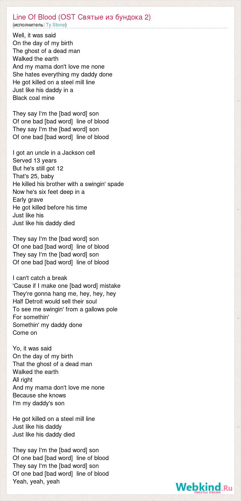Well, it was said On the day of my birth The ghost of a dead man Walked the earth And my mama don't love me none She hates everything my daddy done He got killed on a steel mill line Just like his daddy in a Black coal mine They say I'm the [bad word] son Of one bad [bad word] line of blood They say I'm the [bad word] son Of one bad [bad word] line of blood I got an uncle in a Jackson cell Served 13 years But he's still got 12 That's 25, baby He killed his brother with a swingin' spade Now he's six feet deep in a Early grave He got killed before his time Just like his Just like his daddy died They say I'm the [bad word] son Of one bad [bad word] line of blood They say I'm the [bad word] son Of one bad [bad word] line of blood I can't catch a break 'Cause if I make one [bad word] mistake They're gonna hang me, hey, hey, hey Half Detroit would sell their soul To see me swingin' from a gallows pole For somethin' Somethin' my daddy done Come on Yo, it was said On the day of my birth That the ghost of a dead man Walked the earth All right And my mama don't love me none Because she knows I'm my daddy's son He got killed on a steel mill line Just like his daddy Just like his daddy died They say I'm the [bad word] son Of one bad [bad word] line of blood They say I'm the [bad word] son Of one bad [bad word] line of blood Yeah, yeah, yeah