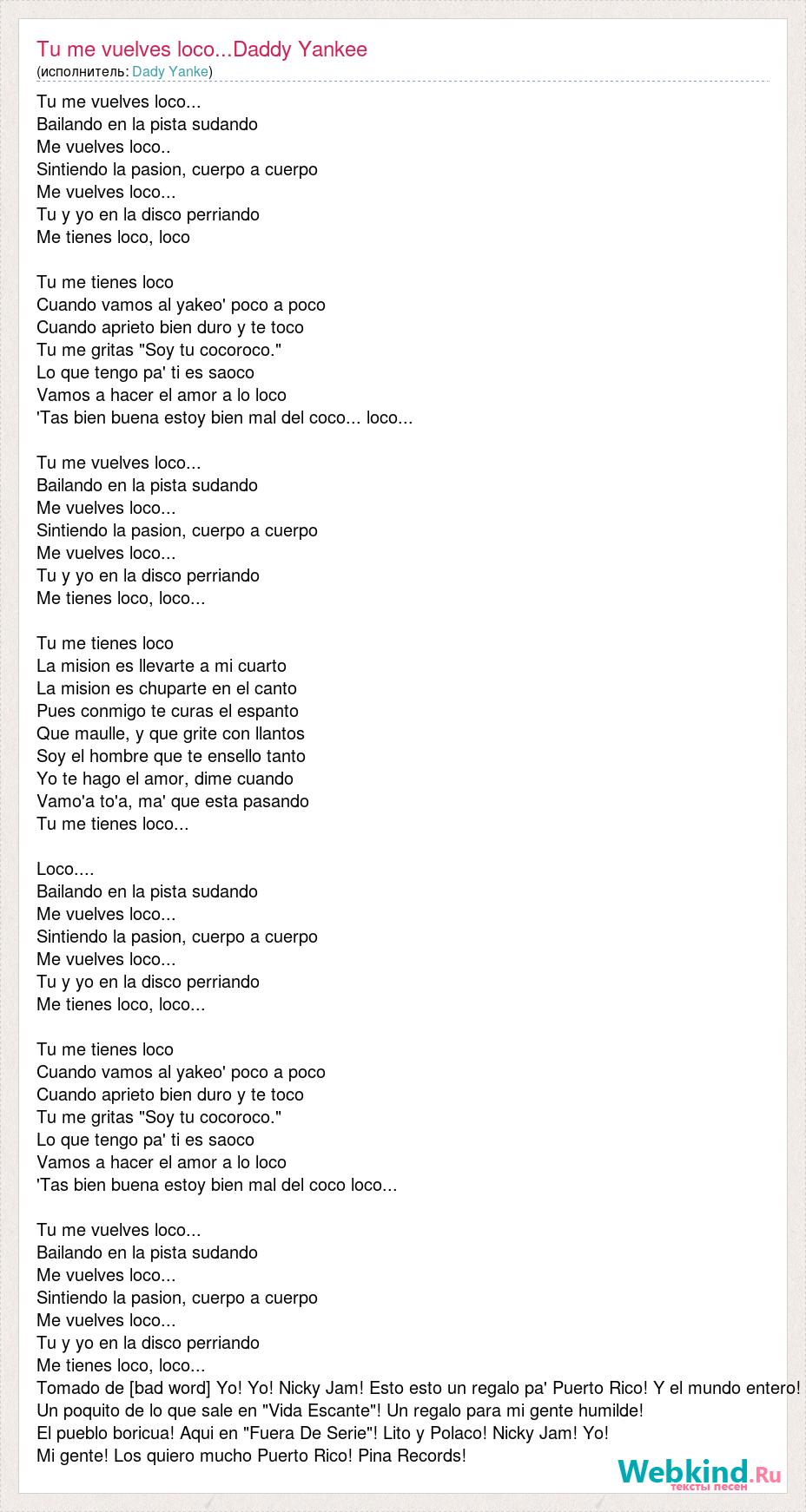 Tu me vuelves loco... Bailando en la pista sudando Me vuelves loco.. Sintiendo la pasion, cuerpo a cuerpo Me vuelves loco... Tu y yo en la disco perriando Me tienes loco, loco Tu me tienes loco Cuando vamos al yakeo' poco a poco Cuando aprieto bien duro y te toco Tu me gritas "Soy tu cocoroco." Lo que tengo pa' ti es saoco Vamos a hacer el amor a lo loco 'Tas bien buena estoy bien mal del coco... loco... Tu me vuelves loco... Bailando en la pista sudando Me vuelves loco... Sintiendo la pasion, cuerpo a cuerpo Me vuelves loco... Tu y yo en la disco perriando Me tienes loco, loco... Tu me tienes loco La mision es llevarte a mi cuarto La mision es chuparte en el canto Pues conmigo te curas el espanto Que maulle, y que grite con llantos Soy el hombre que te ensello tanto Yo te hago el amor, dime cuando Vamo'a to'a, ma' que esta pasando Tu me tienes loco... Loco.... Bailando en la pista sudando Me vuelves loco... Sintiendo la pasion, cuerpo a cuerpo Me vuelves loco... Tu y yo en la disco perriando Me tienes loco, loco... Tu me tienes loco Cuando vamos al yakeo' poco a poco Cuando aprieto bien duro y te toco Tu me gritas "Soy tu cocoroco." Lo que tengo pa' ti es saoco Vamos a hacer el amor a lo loco 'Tas bien buena estoy bien mal del coco loco... Tu me vuelves loco... Bailando en la pista sudando Me vuelves loco... Sintiendo la pasion, cuerpo a cuerpo Me vuelves loco... Tu y yo en la disco perriando Me tienes loco, loco... Tomado de [bad word] Yo! Yo! Nicky Jam! Esto esto un regalo pa' Puerto Rico! Y el mundo entero! Un poquito de lo que sale en "Vida Escante"! Un regalo para mi gente humilde! El pueblo boricua! Aqui en "Fuera De Serie"! Lito y Polaco! Nicky Jam! Yo! Mi gente! Los quiero mucho Puerto Rico! Pina Records!