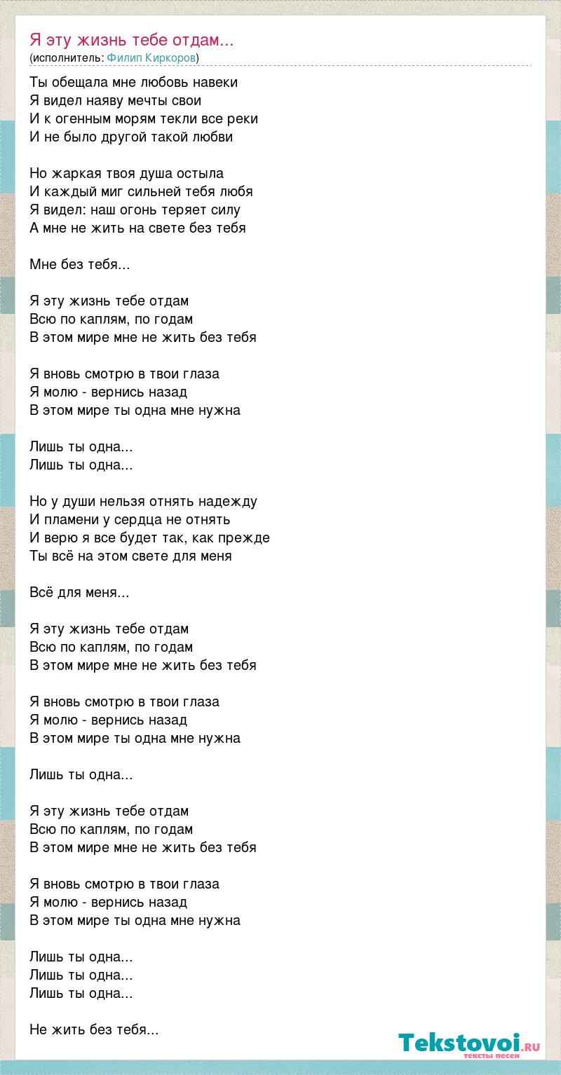 Ты обещала мне любовь навеки Я видел наяву мечты свои И к огенным морям текли все реки И не было другой такой любви Но жаркая твоя душа остыла И каждый миг сильней тебя любя Я видел: наш огонь теряет силу А мне не жить на свете без тебя Мне без тебя... Я эту жизнь тебе отдам Всю по каплям, по годам В этом мире мне не жить без тебя Я вновь смотрю в твои глаза Я молю - вернись назад В этом мире ты одна мне нужна Лишь ты одна... Лишь ты одна... Но у души нельзя отнять надежду И пламени у сердца не отнять И верю я все будет так, как прежде Ты всё на этом свете для меня Всё для меня... Я эту жизнь тебе отдам Всю по каплям, по годам В этом мире мне не жить без тебя Я вновь смотрю в твои глаза Я молю - вернись назад В этом мире ты одна мне нужна Лишь ты одна... Я эту жизнь тебе отдам Всю по каплям, по годам В этом мире мне не жить без тебя Я вновь смотрю в твои глаза Я молю - вернись назад В этом мире ты одна мне нужна Лишь ты одна... Лишь ты одна... Лишь ты одна... Не жить без тебя...