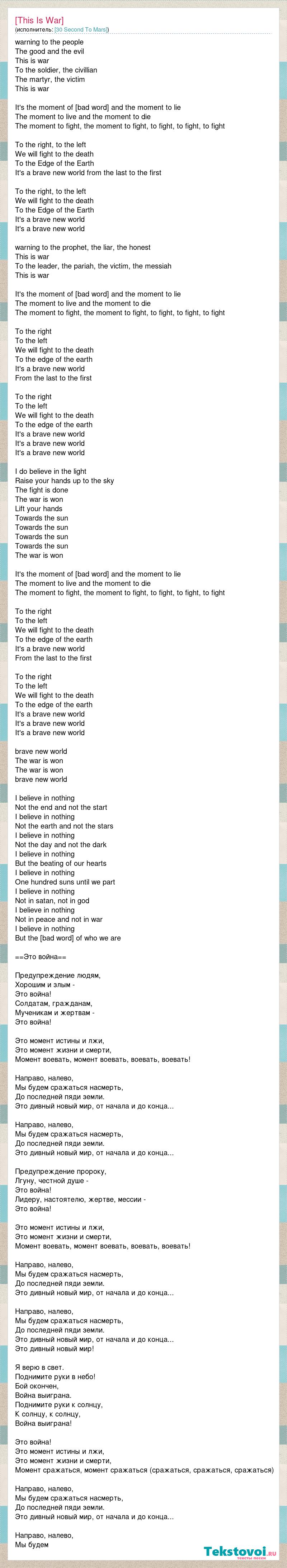 warning to the people The good and the evil This is war To the soldier, the civillian The martyr, the victim This is war It's the moment of truth and the moment to lie The moment to live and the moment to die The moment to fight, the moment to fight, to fight, to fight, to fight To the right, to the left We will fight to the death To the Edge of the Earth It's a brave new world from the last to the first To the right, to the left We will fight to the death To the Edge of the Earth It's a brave new world It's a brave new world warning to the prophet, the liar, the honest This is war To the leader, the pariah, the victim, the messiah This is war It's the moment of truth and the moment to lie The moment to live and the moment to die The moment to fight, the moment to fight, to fight, to fight, to fight To the right To the left We will fight to the death To the edge of the earth It's a brave new world From the last to the first To the right To the left We will fight to the death To the edge of the earth It's a brave new world It's a brave new world It's a brave new world I do believe in the light Raise your hands up to the sky The fight is done The war is won Lift your hands Towards the sun Towards the sun Towards the sun Towards the sun The war is won It's the moment of truth and the moment to lie The moment to live and the moment to die The moment to fight, the moment to fight, to fight, to fight, to fight To the right To the left We will fight to the death To the edge of the earth It's a brave new world From the last to the first To the right To the left We will fight to the death To the edge of the earth It's a brave new world It's a brave new world It's a brave new world brave new world The war is won The war is won brave new world I believe in nothing Not the end and not the start I believe in nothing Not the earth and not the stars I believe in nothing Not the day and not the dark I believe in nothing But the beating of our hearts I believe in nothing One hundred suns until we part I believe in nothing Not in satan, not in god I believe in nothing Not in peace and not in war I believe in nothing But the truth of who we are ==Это война== Предупреждение людям, Хорошим и злым - Это война! Солдатам, гражданам, Мученикам и жертвам - Это война! Это момент истины и лжи, Это момент жизни и смерти, Момент воевать, момент воевать, воевать, воевать! Направо, налево, Мы будем сражаться насмерть, До последней пяди земли. Это дивный новый мир, от начала и до конца... Направо, налево, Мы будем сражаться насмерть, До последней пяди земли. Это дивный новый мир, от начала и до конца... Предупреждение пророку, Лгуну, честной душе - Это война! Лидеру, настоятелю, жертве, мессии - Это война! Это момент истины и лжи, Это момент жизни и смерти, Момент воевать, момент воевать, воевать, воевать! Направо, налево, Мы будем сражаться насмерть, До последней пяди земли. Это дивный новый мир, от начала и до конца... Направо, налево, Мы будем сражаться насмерть, До последней пяди земли. Это дивный новый мир, от начала и до конца... Это дивный новый мир! Я верю в свет. Поднимите руки в небо! Бой окончен, Война выиграна. Поднимите руки к солнцу, К солнцу, к солнцу, Война выиграна! Это война! Это момент истины и лжи, Это момент жизни и смерти, Момент сражаться, момент сражаться (сражаться, сражаться, сражаться) Направо, налево, Мы будем сражаться насмерть, До последней пяди земли. Это дивный новый мир, от начала и до конца... Направо, налево, Мы будем