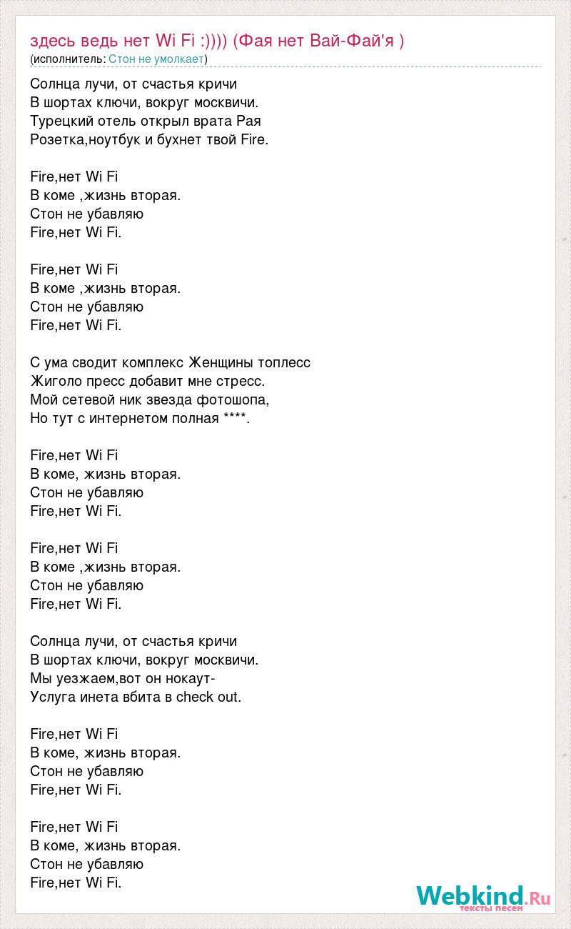 Солнца лучи, от счастья кричи В шортах ключи, вокруг москвичи. Турецкий отель открыл врата Рая Розетка,ноутбук и бухнет твой Fire. Fire,нет Wi Fi В коме ,жизнь вторая. Стон не убавляю Fire,нет Wi Fi. Fire,нет Wi Fi В коме ,жизнь вторая. Стон не убавляю Fire,нет Wi Fi. С ума сводит комплекс Женщины топлесс Жиголо пресс добавит мне стресс. Мой сетевой ник звезда фотошопа, Но тут с интернетом полная ****. Fire,нет Wi Fi В коме, жизнь вторая. Стон не убавляю Fire,нет Wi Fi. Fire,нет Wi Fi В коме ,жизнь вторая. Стон не убавляю Fire,нет Wi Fi. Солнца лучи, от счастья кричи В шортах ключи, вокруг москвичи. Мы уезжаем,вот он нокаут- Услуга инета вбита в check out. Fire,нет Wi Fi В коме, жизнь вторая. Стон не убавляю Fire,нет Wi Fi. Fire,нет Wi Fi В коме, жизнь вторая. Стон не убавляю Fire,нет Wi Fi.