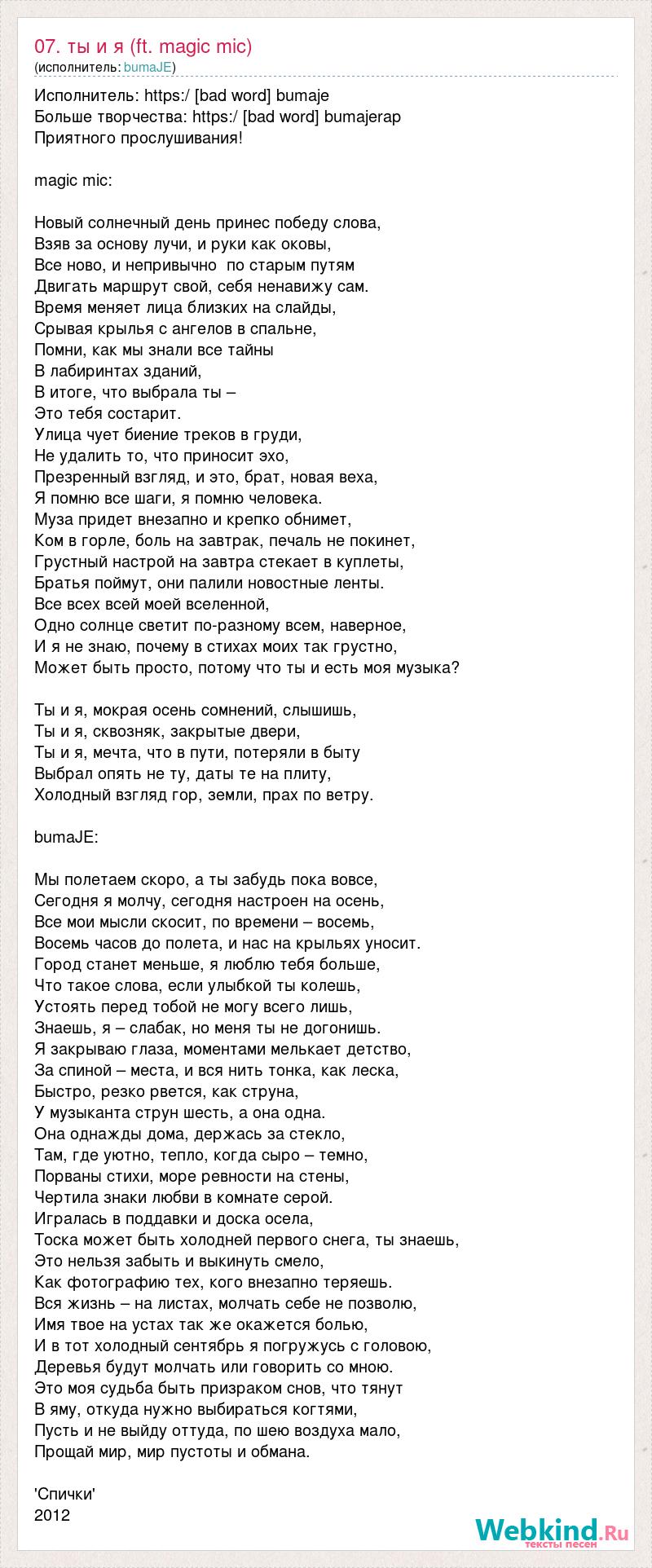 Исполнитель: https:/ [bad word] bumaje Больше творчества: https:/ [bad word] bumajerap Приятного прослушивания! magic mic: Новый солнечный день принес победу слова, Взяв за основу лучи, и руки как оковы, Все ново, и непривычно по старым путям Двигать маршрут свой, себя ненавижу сам. Время меняет лица близких на слайды, Срывая крылья с ангелов в спальне, Помни, как мы знали все тайны В лабиринтах зданий, В итоге, что выбрала ты – Это тебя состарит. Улица чует биение треков в груди, Не удалить то, что приносит эхо, Презренный взгляд, и это, брат, новая веха, Я помню все шаги, я помню человека. Муза придет внезапно и крепко обнимет, Ком в горле, боль на завтрак, печаль не покинет, Грустный настрой на завтра стекает в куплеты, Братья поймут, они палили новостные ленты. Все всех всей моей вселенной, Одно солнце светит по-разному всем, наверное, И я не знаю, почему в стихах моих так грустно, Может быть просто, потому что ты и есть моя музыка? Ты и я, мокрая осень сомнений, слышишь, Ты и я, сквозняк, закрытые двери, Ты и я, мечта, что в пути, потеряли в быту Выбрал опять не ту, даты те на плиту, Холодный взгляд гор, земли, прах по ветру. bumaJE: Мы полетаем скоро, а ты забудь пока вовсе, Сегодня я молчу, сегодня настроен на осень, Все мои мысли скосит, по времени – восемь, Восемь часов до полета, и нас на крыльях уносит. Город станет меньше, я люблю тебя больше, Что такое слова, если улыбкой ты колешь, Устоять перед тобой не могу всего лишь, Знаешь, я – слабак, но меня ты не догонишь. Я закрываю глаза, моментами мелькает детство, За спиной – места, и вся нить тонка, как леска, Быстро, резко рвется, как струна, У музыканта струн шесть, а она одна. Она однажды дома, держась за стекло, Там, где уютно, тепло, когда сыро – темно, Порваны стихи, море ревности на стены, Чертила знаки любви в комнате серой. Игралась в поддавки и доска осела, Тоска может быть холодней первого снега, ты знаешь, Это нельзя забыть и выкинуть смело, Как фотографию тех, кого внезапно теряешь. Вся жизнь – на листах, молчать себе не позволю, Имя твое на устах так же окажется болью, И в тот холодный сентябрь я погружусь с головою, Деревья будут молчать или говорить со мною. Это моя судьба быть призраком снов, что тянут В яму, откуда нужно выбираться когтями, Пусть и не выйду оттуда, по шею воздуха мало, Прощай мир, мир пустоты и обмана. 'Спички' 2012