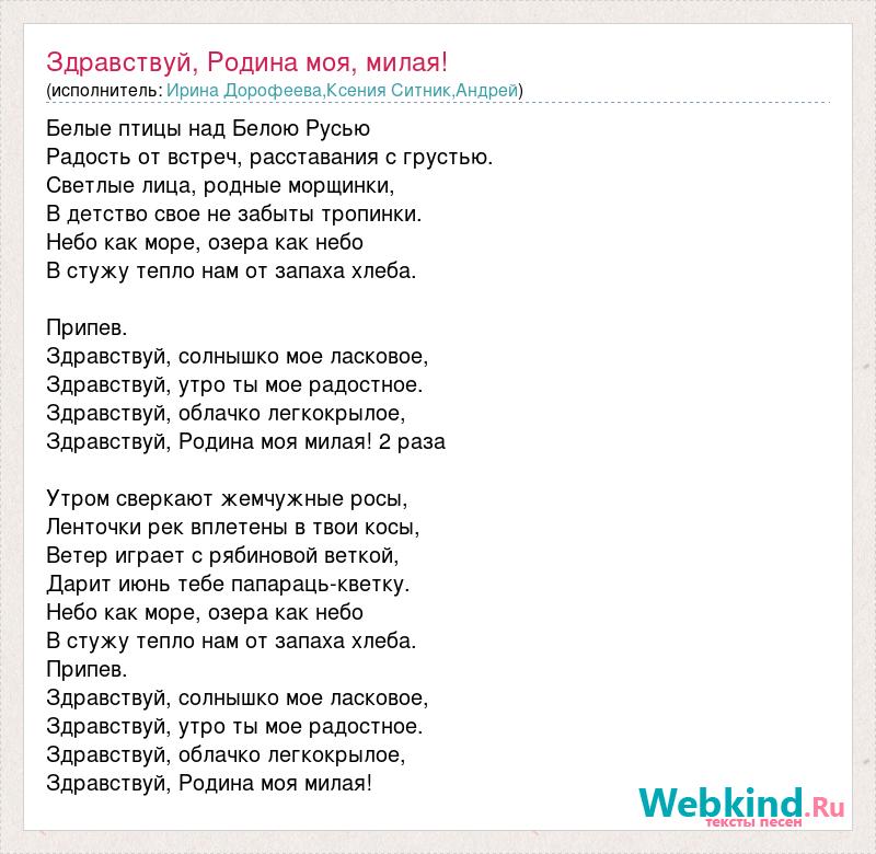 Белые птицы над Белою Русью Радость от встреч, расставания с грустью. Светлые лица, родные морщинки, В детство свое не забыты тропинки. Небо как море, озера как небо В стужу тепло нам от запаха хлеба. Припев. Здравствуй, солнышко мое ласковое, Здравствуй, утро ты мое радостное. Здравствуй, облачко легкокрылое, Здравствуй, Родина моя милая! 2 раза Утром сверкают жемчужные росы, Ленточки рек вплетены в твои косы, Ветер играет с рябиновой веткой, Дарит июнь тебе папараць-кветку. Небо как море, озера как небо В стужу тепло нам от запаха хлеба. Припев. Здравствуй, солнышко мое ласковое, Здравствуй, утро ты мое радостное. Здравствуй, облачко легкокрылое, Здравствуй, Родина моя милая!
