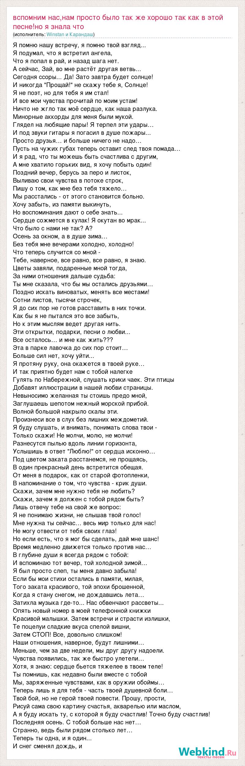 Главная→Исполнители→Winstan и Карандаш→Вспомним нас,нам просто было так же хорошо так как в этой песне!но я знала чт