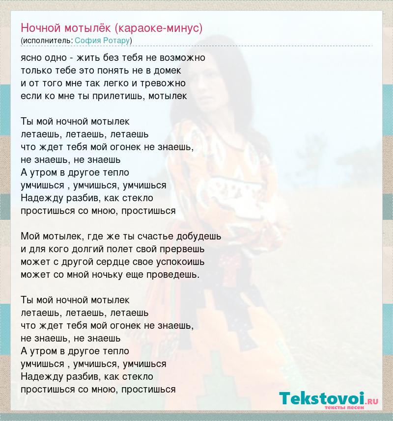 ясно одно - жить без тебя не возможно только тебе это понять не в домек и от того мне так легко и тревожно если ко мне ты прилетишь, мотылек Ты мой ночной мотылек летаешь, летаешь, летаешь что ждет тебя мой огонек не знаешь, не знаешь, не знаешь А утром в другое тепло умчишься , умчишься, умчишься Надежду разбив, как стекло простишься со мною, простишься Мой мотылек, где же ты счастье добудешь и для кого долгий полет свой прервешь может с другой сердце свое успокоишь может со мной ночьку еще проведешь. Ты мой ночной мотылек летаешь, летаешь, летаешь что ждет тебя мой огонек не знаешь, не знаешь, не знаешь А утром в другое тепло умчишься , умчишься, умчишься Надежду разбив, как стекло простишься со мною, простишься