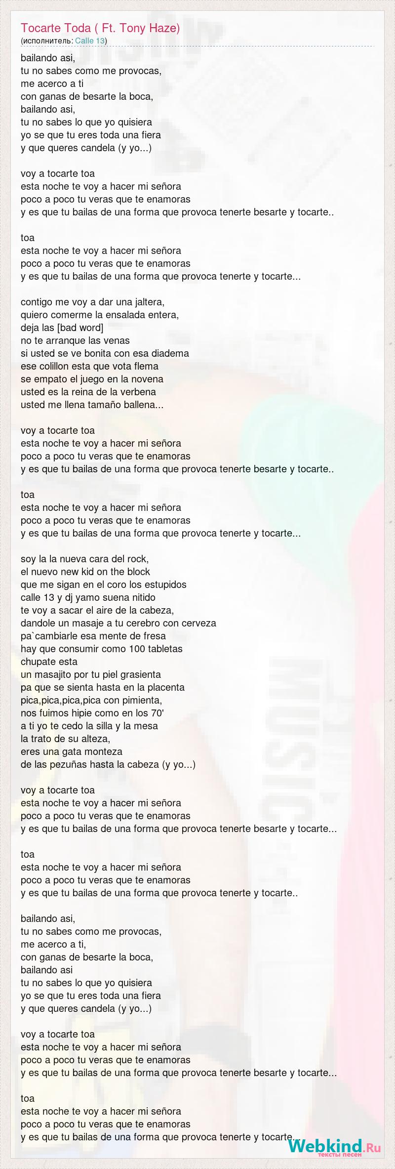 bailando asi, tu no sabes como me provocas, me acerco a ti con ganas de besarte la boca, bailando asi, tu no sabes lo que yo quisiera yo se que tu eres toda una fiera y que queres candela (y yo...) voy a tocarte toa esta noche te voy a hacer mi señora poco a poco tu veras que te enamoras y es que tu bailas de una forma que provoca tenerte besarte y tocarte.. toa esta noche te voy a hacer mi señora poco a poco tu veras que te enamoras y es que tu bailas de una forma que provoca tenerte y tocarte... contigo me voy a dar una jaltera, quiero comerme la ensalada entera, deja las [bad word] no te arranque las venas si usted se ve bonita con esa diadema ese colillon esta que vota flema se empato el juego en la novena usted es la reina de la verbena usted me llena tamaño ballena... voy a tocarte toa esta noche te voy a hacer mi señora poco a poco tu veras que te enamoras y es que tu bailas de una forma que provoca tenerte besarte y tocarte.. toa esta noche te voy a hacer mi señora poco a poco tu veras que te enamoras y es que tu bailas de una forma que provoca tenerte y tocarte... soy la la nueva cara del rock, el nuevo new kid on the block que me sigan en el coro los estupidos calle 13 y dj yamo suena nitido te voy a sacar el aire de la cabeza, dandole un masaje a tu cerebro con cerveza pa`cambiarle esa mente de fresa hay que consumir como 100 tabletas chupate esta un masajito por tu piel grasienta pa que se sienta hasta en la placenta pica,pica,pica,pica con pimienta, nos fuimos hipie como en los 70' a ti yo te cedo la silla y la mesa la trato de su alteza, eres una gata monteza de las pezuñas hasta la cabeza (y yo...) voy a tocarte toa esta noche te voy a hacer mi señora poco a poco tu veras que te enamoras y es que tu bailas de una forma que provoca tenerte besarte y tocarte... toa esta noche te voy a hacer mi señora poco a poco tu veras que te enamoras y es que tu bailas de una forma que provoca tenerte y tocarte.. bailando asi, tu no sabes como me provocas, me acerco a ti, con ganas de besarte la boca, bailando asi tu no sabes lo que yo quisiera yo se que tu eres toda una fiera y que queres candela (y yo...) voy a tocarte toa esta noche te voy a hacer mi señora poco a poco tu veras que te enamoras y es que tu bailas de una forma que provoca tenerte besarte y tocarte... toa esta noche te voy a hacer mi señora poco a poco tu veras que te enamoras y es que tu bailas de una forma que provoca tenerte y tocarte...