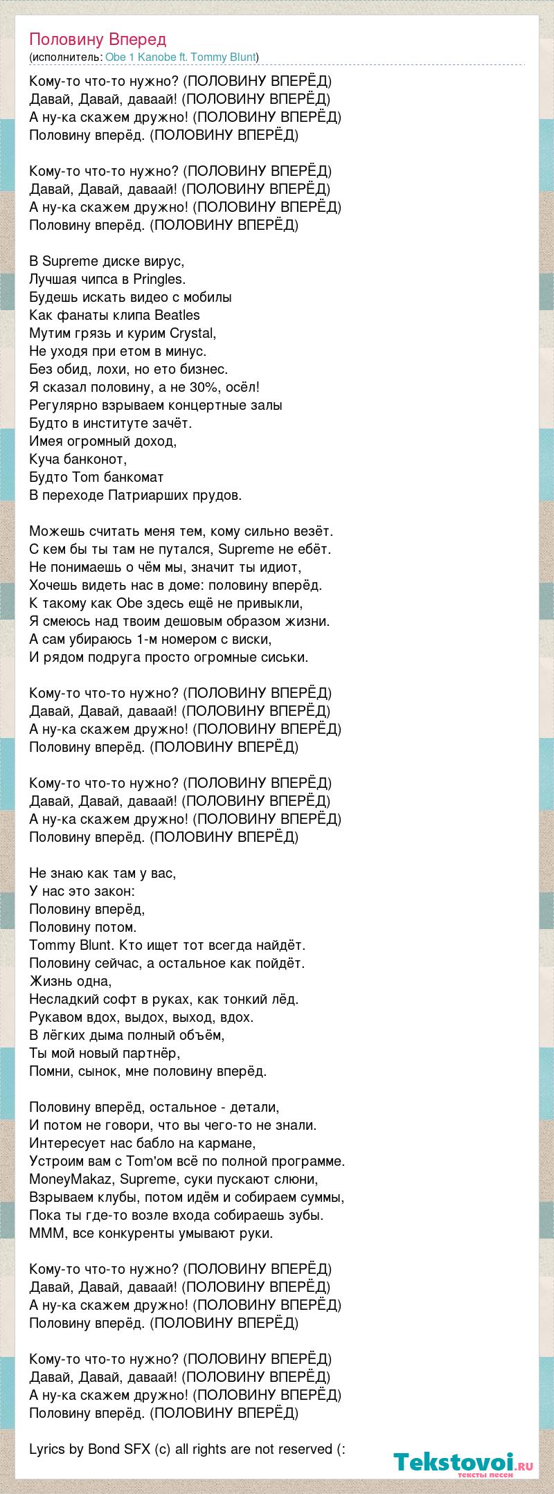 Кому-то что-то нужно? (ПОЛОВИНУ ВПЕРЁД) Давай, Давай, даваай! (ПОЛОВИНУ ВПЕРЁД) А ну-ка скажем дружно! (ПОЛОВИНУ ВПЕРЁД) Половину вперёд. (ПОЛОВИНУ ВПЕРЁД) Кому-то что-то нужно? (ПОЛОВИНУ ВПЕРЁД) Давай, Давай, даваай! (ПОЛОВИНУ ВПЕРЁД) А ну-ка скажем дружно! (ПОЛОВИНУ ВПЕРЁД) Половину вперёд. (ПОЛОВИНУ ВПЕРЁД) В Supreme диске вирус, Лучшая чипса в Pringles. Будешь искать видео с мобилы Как фанаты клипа Beatles Мутим грязь и курим Crystal, Не уходя при етом в минус. Без обид, лохи, но ето бизнес. Я сказал половину, а не 30%, осёл! Регулярно взрываем концертные залы Будто в институте зачёт. Имея огромный доход, Куча банконот, Будто Tom банкомат В переходе Патриарших прудов. Можешь считать меня тем, кому сильно везёт. С кем бы ты там не путался, Supreme не ебёт. Не понимаешь о чём мы, значит ты идиот, Хочешь видеть нас в доме: половину вперёд. К такому как Obe здесь ещё не привыкли, Я смеюсь над твоим дешовым образом жизни. А сам убираюсь 1-м номером с виски, И рядом подруга просто огромные сиськи. Кому-то что-то нужно? (ПОЛОВИНУ ВПЕРЁД) Давай, Давай, даваай! (ПОЛОВИНУ ВПЕРЁД) А ну-ка скажем дружно! (ПОЛОВИНУ ВПЕРЁД) Половину вперёд. (ПОЛОВИНУ ВПЕРЁД) Кому-то что-то нужно? (ПОЛОВИНУ ВПЕРЁД) Давай, Давай, даваай! (ПОЛОВИНУ ВПЕРЁД) А ну-ка скажем дружно! (ПОЛОВИНУ ВПЕРЁД) Половину вперёд. (ПОЛОВИНУ ВПЕРЁД) Не знаю как там у вас, У нас это закон: Половину вперёд, Половину потом. Tommy Blunt. Кто ищет тот всегда найдёт. Половину сейчас, а остальное как пойдёт. Жизнь одна, Несладкий софт в руках, как тонкий лёд. Рукавом вдох, выдох, выход, вдох. В лёгких дыма полный объём, Ты мой новый партнёр, Помни, сынок, мне половину вперёд. Половину вперёд, остальное - детали, И потом не говори, что вы чего-то не знали. Интересует нас бабло на кармане, Устроим вам с Tom'ом всё по полной программе. MoneyMakaz, Supreme, суки пускают слюни, Взрываем клубы, потом идём и собираем суммы, Пока ты где-то возле входа собираешь зубы. MMM, все конкуренты умывают руки. Кому-то что-то нужно? (ПОЛОВИНУ ВПЕРЁД) Давай, Давай, даваай! (ПОЛОВИНУ ВПЕРЁД) А ну-ка скажем дружно! (ПОЛОВИНУ ВПЕРЁД) Половину вперёд. (ПОЛОВИНУ ВПЕРЁД) Кому-то что-то нужно? (ПОЛОВИНУ ВПЕРЁД) Давай, Давай, даваай! (ПОЛОВИНУ ВПЕРЁД) А ну-ка скажем дружно! (ПОЛОВИНУ ВПЕРЁД) Половину вперёд. (ПОЛОВИНУ ВПЕРЁД) Lyrics by Bond SFX (c) all rights are not reserved (: