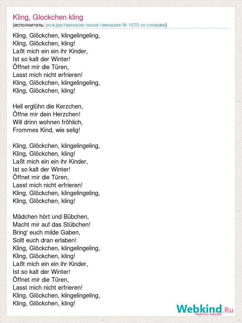 Kling, Glöckchen, klingelingeling, Kling, Glöckchen, kling! Laßt mich ein ein ihr Kinder, Ist so kalt der Winter! Öffnet mir die Türen, Lasst mich nicht erfrieren! Kling, Glöckchen, klingelingeling, Kling, Glöckchen, kling! Hell erglühn die Kerzchen, Öffne mir dein Herzchen! Will drinn wohnen fröhlich, Frommes Kind, wie selig! Kling, Glöckchen, klingelingeling, Kling, Glöckchen, kling! Laßt mich ein ein ihr Kinder, Ist so kalt der Winter! Öffnet mir die Türen, Lasst mich nicht erfrieren! Kling, Glöckchen, klingelingeling, Kling, Glöckchen, kling! Mädchen hört und Bübchen, Macht mir auf das Stübchen! Bring' euch milde Gaben, Sollt euch dran erlaben! Kling, Glöckchen, klingelingeling, Kling, Glöckchen, kling! Laßt mich ein ein ihr Kinder, Ist so kalt der Winter! Öffnet mir die Türen, Lasst mich nicht erfrieren! Kling, Glöckchen, klingelingeling, Kling, Glöckchen, kling!