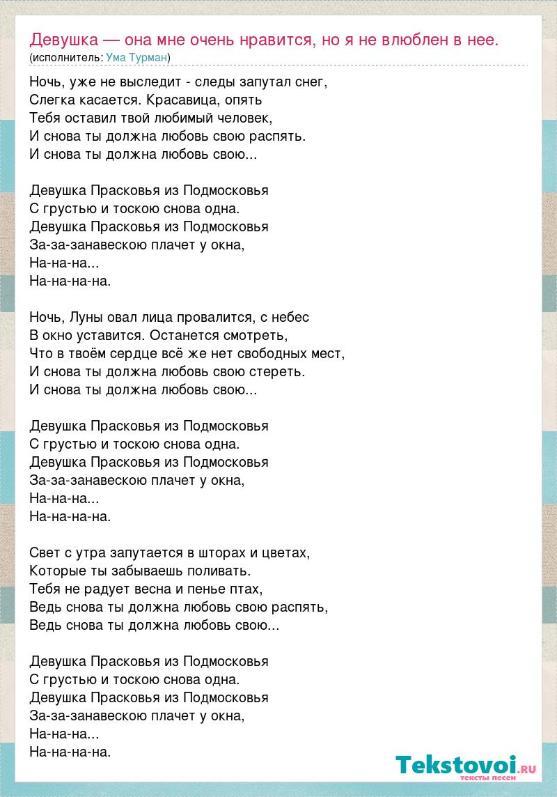 Ночь, уже не выследит - следы запутал снег, Слегка касается. Красавица, опять Тебя оставил твой любимый человек, И снова ты должна любовь свою распять. И снова ты должна любовь свою... Девушка Прасковья из Подмосковья С грустью и тоскою снова одна. Девушка Прасковья из Подмосковья За-за-занавескою плачет у окна, На-на-на... На-на-на-на. Ночь, Луны овал лица провалится, с небес В окно уставится. Останется смотреть, Что в твоём сердце всё же нет свободных мест, И снова ты должна любовь свою стереть. И снова ты должна любовь свою... Девушка Прасковья из Подмосковья С грустью и тоскою снова одна. Девушка Прасковья из Подмосковья За-за-занавескою плачет у окна, На-на-на... На-на-на-на. Свет с утра запутается в шторах и цветах, Которые ты забываешь поливать. Тебя не радует весна и пенье птах, Ведь снова ты должна любовь свою распять, Ведь снова ты должна любовь свою... Девушка Прасковья из Подмосковья С грустью и тоскою снова одна. Девушка Прасковья из Подмосковья За-за-занавескою плачет у окна, На-на-на... На-на-на-на.