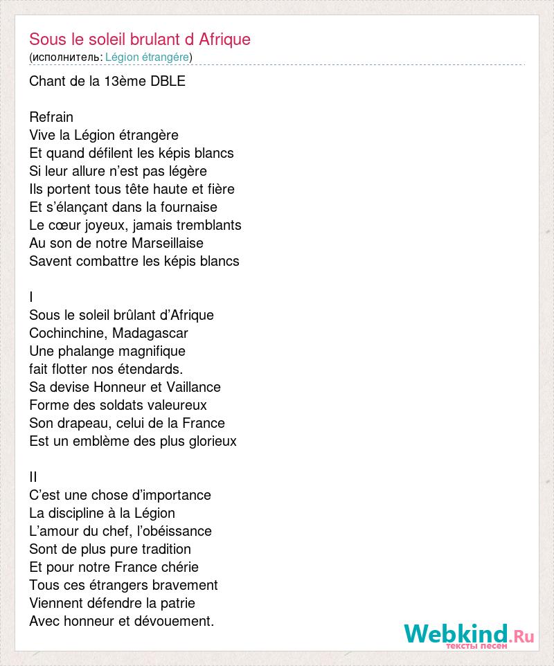 Chant de la 13ème DBLE Refrain Vive la Légion étrangère Et quand défilent les képis blancs Si leur allure n’est pas légère Ils portent tous tête haute et fière Et s’élançant dans la fournaise Le cœur joyeux, jamais tremblants Au son de notre Marseillaise Savent combattre les képis blancs I Sous le soleil brûlant d’Afrique Cochinchine, Madagascar Une phalange magnifique fait flotter nos étendards. Sa devise Honneur et Vaillance Forme des soldats valeureux Son drapeau, celui de la France Est un emblème des plus glorieux II C’est une chose d’importance La discipline à la Légion L’amour du chef, l’obéissance Sont de plus pure tradition Et pour notre France chérie Tous ces étrangers bravement Viennent défendre la patrie Avec honneur et dévouement.