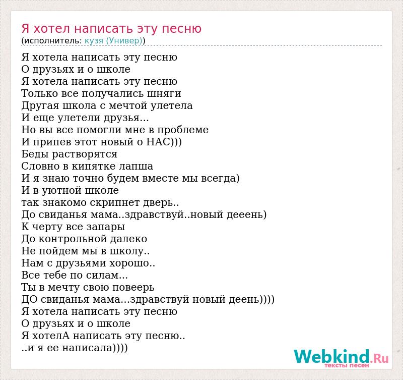 Я хотела написать эту песню О друзьях и о школе Я хотела написать эту песню Только все получались шняги Другая школа с мечтой улетела И еще улетели друзья... Но вы все помогли мне в проблеме И припев этот новый о НАС))) Беды растворятся Словно в кипятке лапша И я знаю точно будем вместе мы всегда) И в уютной школе так знакомо скрипнет дверь.. До свиданья мама..здравствуй..новый дееень) К черту все запары До контрольной далеко Не пойдем мы в школу.. Нам с друзьями хорошо.. Все тебе по силам... Ты в мечту свою повеерь ДО свиданья мама...здравствуй новый деень)))) Я хотела написать эту песню О друзьях и о школе Я хотелА написать эту песню.. ..и я ее написала))))