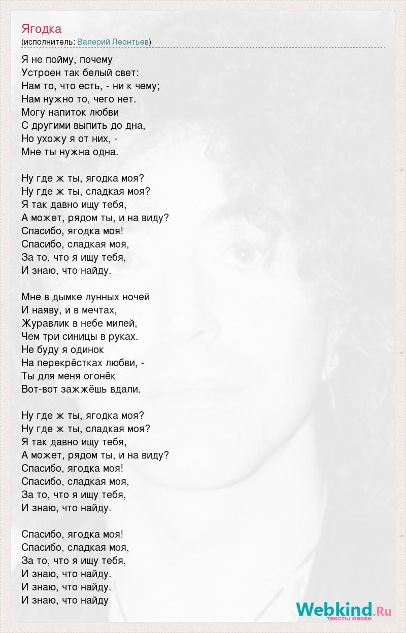 Я не пойму, почему Устроен так белый свет: Нам то, что есть, - ни к чему; Нам нужно то, чего нет. Могу напиток любви С другими выпить до дна, Но ухожу я от них, - Мне ты нужна одна. Ну где ж ты, ягодка моя? Ну где ж ты, сладкая моя? Я так давно ищу тебя, А может, рядом ты, и на виду? Спасибо, ягодка моя! Спасибо, сладкая моя, За то, что я ищу тебя, И знаю, что найду. Мне в дымке лунных ночей И наяву, и в мечтах, Журавлик в небе милей, Чем три синицы в руках. Не буду я одинок На перекрёстках любви, - Ты для меня огонёк Вот-вот зажжёшь вдали. Ну где ж ты, ягодка моя? Ну где ж ты, сладкая моя? Я так давно ищу тебя, А может, рядом ты, и на виду? Спасибо, ягодка моя! Спасибо, сладкая моя, За то, что я ищу тебя, И знаю, что найду. Спасибо, ягодка моя! Спасибо, сладкая моя, За то, что я ищу тебя, И знаю, что найду. И знаю, что найду. И знаю, что найду