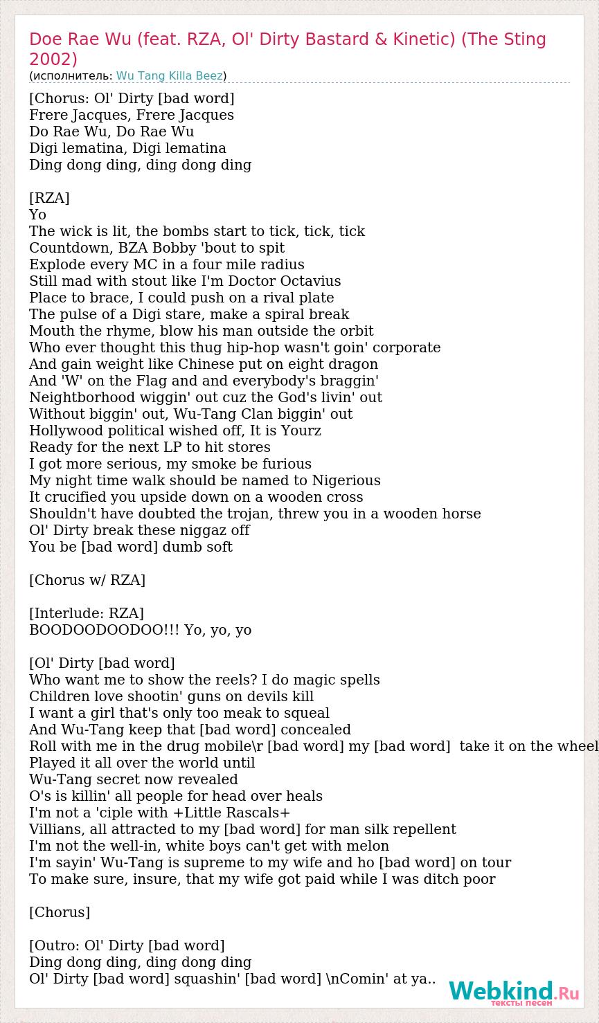 [Chorus: Ol' Dirty [bad word] Frere Jacques, Frere Jacques Do Rae Wu, Do Rae Wu Digi lematina, Digi lematina Ding dong ding, ding dong ding [RZA] Yo The wick is lit, the bombs start to tick, tick, tick Countdown, BZA Bobby 'bout to spit Explode every MC in a four mile radius Still mad with stout like I'm Doctor Octavius Place to brace, I could push on a rival plate The pulse of a Digi stare, make a spiral break Mouth the rhyme, blow his man outside the orbit Who ever thought this thug hip-hop wasn't goin' corporate And gain weight like Chinese put on eight dragon And 'W' on the Flag and and everybody's braggin' Neightborhood wiggin' out cuz the God's livin' out Without biggin' out, Wu-Tang Clan biggin' out Hollywood political wished off, It is Yourz Ready for the next LP to hit stores I got more serious, my smoke be furious My night time walk should be named to Nigerious It crucified you upside down on a wooden cross Shouldn't have doubted the trojan, threw you in a wooden horse Ol' Dirty break these niggaz off You be [bad word] dumb soft [Chorus w/ RZA] [Interlude: RZA] BOODOODOODOO!!! Yo, yo, yo [Ol' Dirty [bad word] Who want me to show the reels? I do magic spells Children love shootin' guns on devils kill I want a girl that's only too meak to squeal And Wu-Tang keep that [bad word] concealed Roll with me in the drug mobile\r [bad word] my [bad word] take it on the wheel Played it all over the world until Wu-Tang secret now revealed O's is killin' all people for head over heals I'm not a 'ciple with +Little Rascals+ Villians, all attracted to my [bad word] for man silk repellent I'm not the well-in, white boys can't get with melon I'm sayin' Wu-Tang is supreme to my wife and ho [bad word] on tour To make sure, insure, that my wife got paid while I was ditch poor [Chorus] [Outro: Ol' Dirty [bad word] Ding dong ding, ding dong ding Ol' Dirty [bad word] squashin' [bad word] \nComin' at ya..