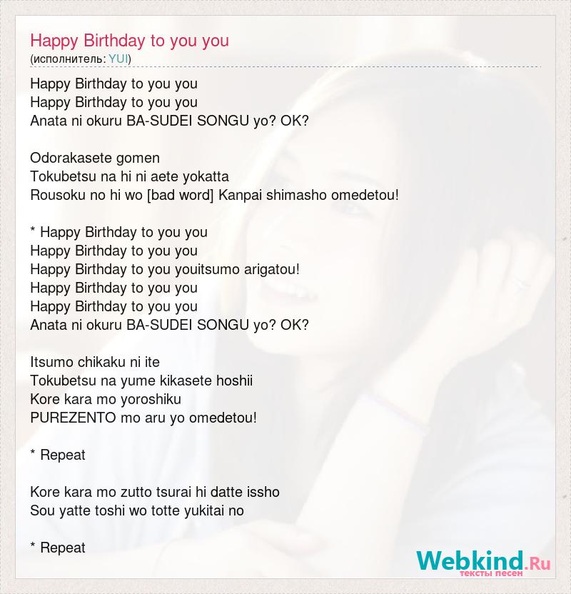 Happy Birthday to you you Happy Birthday to you you Anata ni okuru BA-SUDEI SONGU yo? OK? Odorakasete gomen Tokubetsu na hi ni aete yokatta Rousoku no hi wo [bad word] Kanpai shimasho omedetou! * Happy Birthday to you you Happy Birthday to you you Happy Birthday to you youitsumo arigatou! Happy Birthday to you you Happy Birthday to you you Anata ni okuru BA-SUDEI SONGU yo? OK? Itsumo chikaku ni ite Tokubetsu na yume kikasete hoshii Kore kara mo yoroshiku PUREZENTO mo aru yo omedetou! * Repeat Kore kara mo zutto tsurai hi datte issho Sou yatte toshi wo totte yukitai no * Repeat