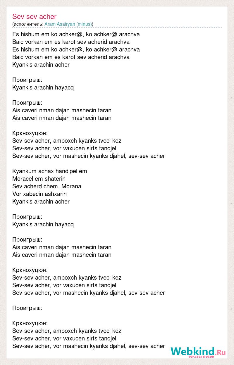 Es hishum em ko achker@, ko achker@ arachva Baic vorkan em es karot sev acherid arachva Es hishum em ko achker@, ko achker@ arachva Baic vorkan em es karot sev acherid arachva Kyankis arachin acher Проигрыш: Kyankis arachin hayacq Проигрыш: Ais caveri nman dajan mashecin taran Ais caveri nman dajan mashecin taran Кркнохуцюн: Sev-sev acher, amboxch kyanks tveci kez Sev-sev acher, vor vaxucen sirts tandjel Sev-sev acher, vor mashecin kyanks djahel, sev-sev acher Kyankum achax handipel em Moracel em shaterin Sev acherd chem. Morana Vor xabecin ashxarin Kyankis arachin acher Проигрыш: Kyankis arachin hayacq Проигрыш: Ais caveri nman dajan mashecin taran Ais caveri nman dajan mashecin taran Кркнохуцюн: Sev-sev acher, amboxch kyanks tveci kez Sev-sev acher, vor vaxucen sirts tandjel Sev-sev acher, vor mashecin kyanks djahel, sev-sev acher Проигрыш: Кркнохуцюн: Sev-sev acher, amboxch kyanks tveci kez Sev-sev acher, vor vaxucen sirts tandjel Sev-sev acher, vor mashecin kyanks djahel, sev-sev acher