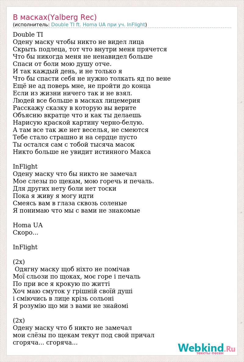 Double TI Одену маску чтобы никто не видел лица Скрыть подлеца, тот что внутри меня прячется Что бы никогда меня не ненавидел больше Спаси от боли мою душу отче. И так каждый день, и не только я Что бы спасти себя не нужно толкать яд по вене Ещё не ад поверь мне, не пройти до конца Если из жизни ничего так и не взял. Людей все больше в масках лицемерия Расскажу сказку в которую вы верите Объясню вкратце что и как ты делаешь Нарисую краской картину черно-белую. А там все так же нет веселья, не смеются Тебе стало страшно и на сердце пусто Ты остался сам с тобой тысяча масок Никто больше не увидит истинного Макса InFlight Одену маску что бы никто не замечал Мое слезы по щекам, мою горечь и печаль. Для других нету боли нет тоски Пока я живу я могу идти Смеясь вам в глаза сквозь соленые Я понимаю что мы с вами не знакомые Homa UA Скоро... InFlight (2х) Одягну маску щоб ніхто не помічав Мої сльози по щоках, моє горе і печаль По при все я крокую по житті Хоч маю смуток у грішній своїй душі і сміючись в лице крізь сольоні Я розумію що ми з вами не знайомі (2х) Одену маску что б никто не замечал мои слёзы по щекам текут под свой причал сгоряча... сгоряча...
