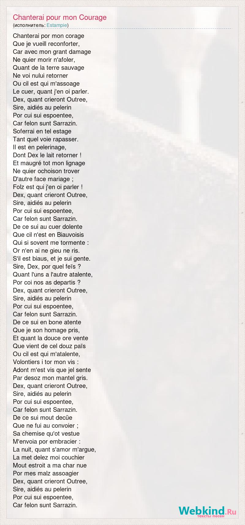 Chanterai por mon corage Que je vueill reconforter, Car avec mon grant damage Ne quier morir n'afoler, Quant de la terre sauvage Ne voi nului retorner Ou cil est qui m'assoage Le cuer, quant j'en oi parler. Dex, quant crieront Outree, Sire, aidiés au pelerin Por cui sui espoentee, Car felon sunt Sarrazin. Soferrai en tel estage Tant quel voie rapasser. Il est en pelerinage, Dont Dex le lait retorner ! Et maugré tot mon lignage Ne quier ochoison trover D'autre face mariage ; Folz est qui j'en oi parler ! Dex, quant crieront Outree, Sire, aidiés au pelerin Por cui sui espoentee, Car felon sunt Sarrazin. De ce sui au cuer dolente Que cil n'est en Biauvoisis Qui si sovent me tormente : Or n'en ai ne gieu ne ris. S'il est biaus, et je sui gente. Sire, Dex, por quel feïs ? Quant l'uns a l'autre atalente, Por coi nos as departis ? Dex, quant crieront Outree, Sire, aidiés au pelerin Por cui sui espoentee, Car felon sunt Sarrazin. De ce sui en bone atente Que je son homage pris, Et quant la douce ore vente Que vient de cel douz païs Ou cil est qui m'atalente, Volontiers i tor mon vis : Adont m'est vis que jel sente Par desoz mon mantel gris. Dex, quant crieront Outree, Sire, aidiés au pelerin Por cui sui espoentee, Car felon sunt Sarrazin. De ce sui mout decüe Que ne fui au convoier ; Sa chemise qu'ot vestue M'envoia por embracier : La nuit, quant s'amor m'argue, La met delez moi couchier Mout estroit a ma char nue Por mes malz assoagier Dex, quant crieront Outree, Sire, aidiés au pelerin Por cui sui espoentee, Car felon sunt Sarrazin.