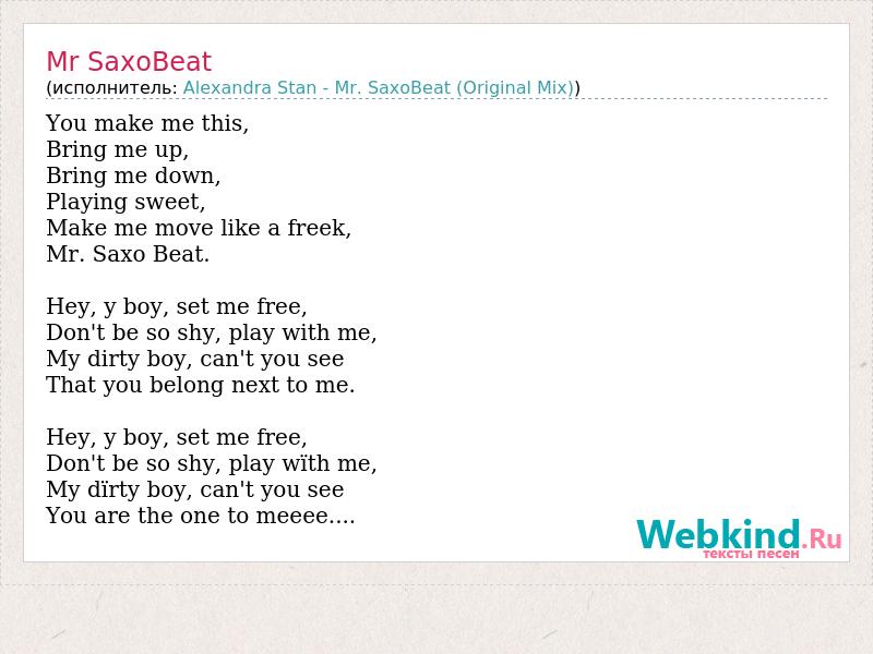 You make me this, Bring me up, Bring me down, Playing sweet, Make me move like a freek, Mr. Saxo Beat. Hey, y boy, set me free, Don't be so shy, play with me, My dirty boy, can't you see That you belong next to me. Hey, y boy, set me free, Don't be so shy, play wïth me, My dïrty boy, can't you see You are the one to meeee....