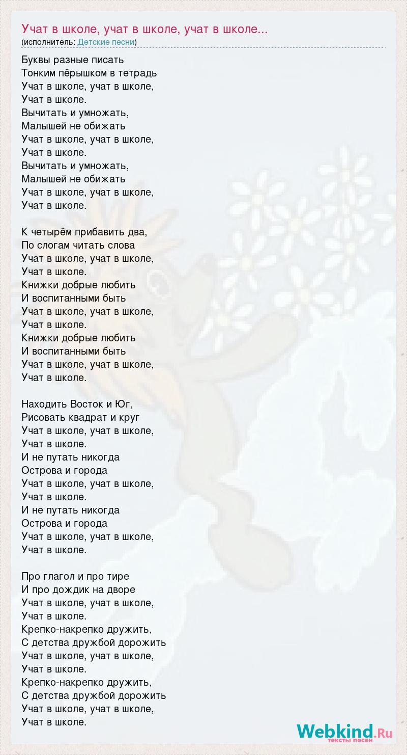 Буквы разные писать Тонким пёрышком в тетрадь Учат в школе, учат в школе, Учат в школе. Вычитать и умножать, Малышей не обижать Учат в школе, учат в школе, Учат в школе. Вычитать и умножать, Малышей не обижать Учат в школе, учат в школе, Учат в школе. К четырём прибавить два, По слогам читать слова Учат в школе, учат в школе, Учат в школе. Книжки добрые любить И воспитанными быть Учат в школе, учат в школе, Учат в школе. Книжки добрые любить И воспитанными быть Учат в школе, учат в школе, Учат в школе. Находить Восток и Юг, Рисовать квадрат и круг Учат в школе, учат в школе, Учат в школе. И не путать никогда Острова и города Учат в школе, учат в школе, Учат в школе. И не путать никогда Острова и города Учат в школе, учат в школе, Учат в школе. Про глагол и про тире И про дождик на дворе Учат в школе, учат в школе, Учат в школе. Крепко-накрепко дружить, С детства дружбой дорожить Учат в школе, учат в школе, Учат в школе. Крепко-накрепко дружить, С детства дружбой дорожить Учат в школе, учат в школе, Учат в школе.