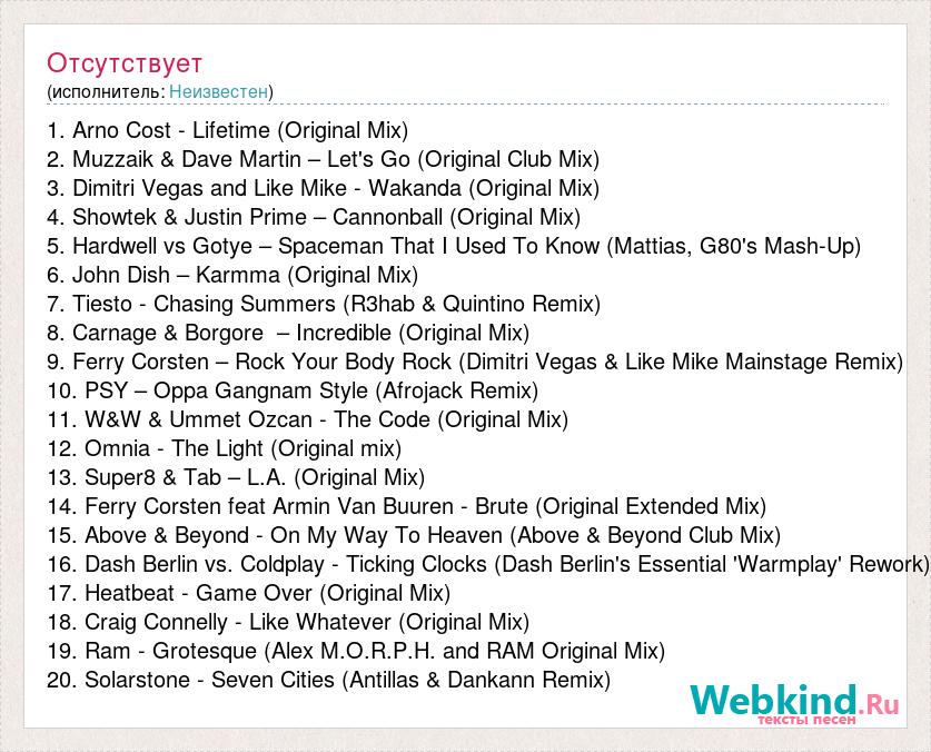 1. Arno Cost - Lifetime (Original Mix) 2. Muzzaik & Dave Martin – Let's Go (Original Club Mix) 3. Dimitri Vegas and Like Mike - Wakanda (Original Mix) 4. Showtek & Justin Prime – Cannonball (Original Mix) 5. Hardwell vs Gotye – Spaceman That I Used To Know (Mattias, G80's Mash-Up) 6. John Dish – Karmma (Original Mix) 7. Tiesto - Chasing Summers (R3hab & Quintino Remix) 8. Carnage & Borgore – Incredible (Original Mix) 9. Ferry Corsten – Rock Your Body Rock (Dimitri Vegas & Like Mike Mainstage Remix) 10. PSY – Oppa Gangnam Style (Afrojack Remix) 11. W&W & Ummet Ozcan - The Code (Original Mix) 12. Omnia - The Light (Original mix) 13. Super8 & Tab – L.A. (Original Mix) 14. Ferry Corsten feat Armin Van Buuren - Brute (Original Extended Mix) 15. Above & Beyond - On My Way To Heaven (Above & Beyond Club Mix) 16. Dash Berlin vs. Coldplay - Ticking Clocks (Dash Berlin's Essential 'Warmplay' Rework) 17. Heatbeat - Game Over (Original Mix) 18. Craig Connelly - Like Whatever (Original Mix) 19. Ram - Grotesque (Alex M.O.R.P.H. and RAM Original Mix) 20. Solarstone - Seven Cities (Antillas & Dankann Remix)