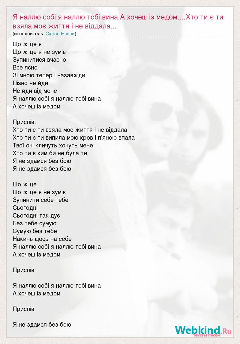 Главная→Исполнители→Океан Ельзи→Я наллю собі я наллю тобі вина А хочеш із медом....Хто ти є ти взяла