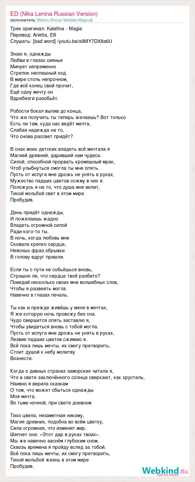 Трек оригинал: Kalafina - Magia Перевод: Arietta, Elli Слушать: [bad word] /youtu.be/s9MY7DX8a6U Знаю я, однажды Любви в глазах сиянье Минует непременно Стрелок неспешный ход. В мире столь непрочном, Где всё конец свой прочит, Ещё одну мечту он Вдребезги разобьёт. Робости бокал выпив до конца, Что же получить ты теперь желаешь? Вот только Есть ли там, куда нас ведёт мечта, Слабая надежда на то, Что снова рассвет придёт? В снах моих детских владеть всё мечтала я Магией древней, дарившей нам чудеса. Силой, способной прорвать кромешный мрак, Чтоб улыбнуться смогла ты мне опять. Пусть от испуга мне дрожь не унять в руках, Мужество падших цветов сожму в них я. Положусь я на то, что душа мне велит, Тихой мольбой свет в этом мире Пробудив. День придёт однажды, И пожелаешь жадно Владеть огромной силой Ради кого-то ты. В ночь, когда любовь мне Сковала крепко сердце, Неясных фраз обрывки В голову вдруг пришли. Если ты с пути не собьёшься вновь, Страшно ли, что сердце твоё разбито? Поведай несколько своих мне волшебных слов, Чтобы я развеять могла Навечно в глазах печаль. Ты как и прежде живёшь у меня в мечтах, Я же которую ночь провожу без сна. Чудо свершится опять заставлю я, Чтобы увидеться вновь с тобой могла. Пусть от испуга мне дрожь не унять в руках, Лезвие падших цветов сжимаю я. Всё пока лишь мечты, их смогу претворить, Стоит душой к небу молитву Вознести. Когда о дивных странах заморских читала я, Что в свете заключённого солнца сверкают, как хрусталь, Наивно я верила сказкам О том, что может сбыться однажды Моя мечта. Во тьме ночной, при свете дневном Тихо цвела, незаметная никому, Магия древних, подобна во всём цветку, Сила огромная, что изменит мир. Шепчет она: «Этот дар в руках твоих». Мы же навечно заснём глубоким сном. Сквозь времена я пройду вслед за тобой. Всё пока лишь мечты, их смогу претворить, Тихой мольбой жизнь в этом мире Пробудив.