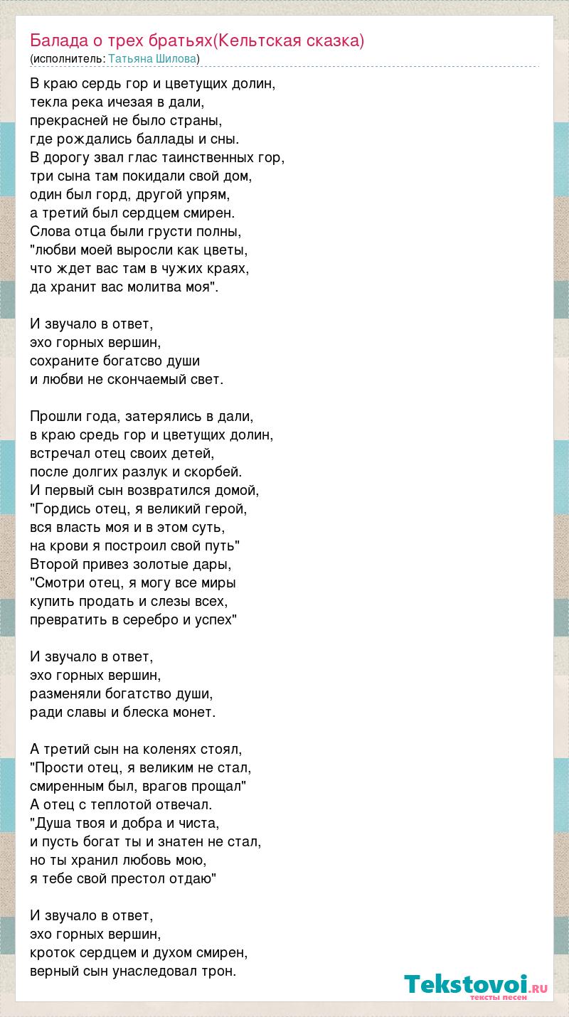 В краю сердь гор и цветущих долин, текла река ичезая в дали, прекрасней не было страны, где рождались баллады и сны. В дорогу звал глас таинственных гор, три сына там покидали свой дом, один был горд, другой упрям, а третий был сердцем смирен. Слова отца были грусти полны, "любви моей выросли как цветы, что ждет вас там в чужих краях, да хранит вас молитва моя". И звучало в ответ, эхо горных вершин, сохраните богатсво души и любви не скончаемый свет. Прошли года, затерялись в дали, в краю средь гор и цветущих долин, встречал отец своих детей, после долгих разлук и скорбей. И первый сын возвратился домой, "Гордись отец, я великий герой, вся власть моя и в этом суть, на крови я построил свой путь" Второй привез золотые дары, "Смотри отец, я могу все миры купить продать и слезы всех, превратить в серебро и успех" И звучало в ответ, эхо горных вершин, разменяли богатство души, ради славы и блеска монет. А третий сын на коленях стоял, "Прости отец, я великим не стал, смиренным был, врагов прощал" А отец с теплотой отвечал. "Душа твоя и добра и чиста, и пусть богат ты и знатен не стал, но ты хранил любовь мою, я тебе свой престол отдаю" И звучало в ответ, эхо горных вершин, кроток сердцем и духом смирен, верный сын унаследовал трон.