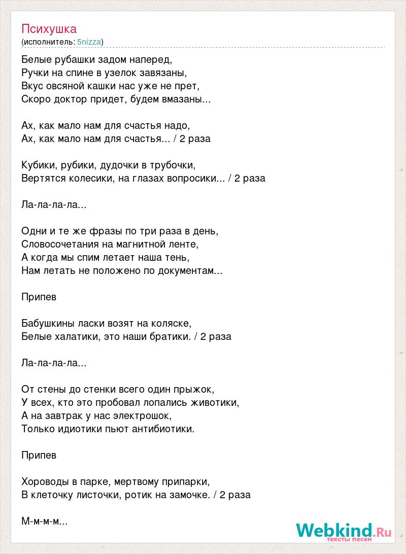 Белые рубашки задом наперед, Ручки на спине в узелок завязаны, Вкус овсяной кашки нас уже не прет, Скоро доктор придет, будем вмазаны... Ах, как мало нам для счастья надо, Ах, как мало нам для счастья... / 2 раза Кубики, рубики, дудочки в трубочки, Вертятся колесики, на глазах вопросики... / 2 раза Ла-ла-ла-ла... Одни и те же фразы по три раза в день, Словосочетания на магнитной ленте, А когда мы спим летает наша тень, Нам летать не положено по документам... Припев Бабушкины ласки возят на коляске, Белые халатики, это наши братики. / 2 раза Ла-ла-ла-ла... От стены до стенки всего один прыжок, У всех, кто это пробовал лопались животики, А на завтрак у нас электрошок, Только идиотики пьют антибиотики. Припев Хороводы в парке, мертвому припарки, В клеточку листочки, ротик на замочке. / 2 раза М-м-м-м...