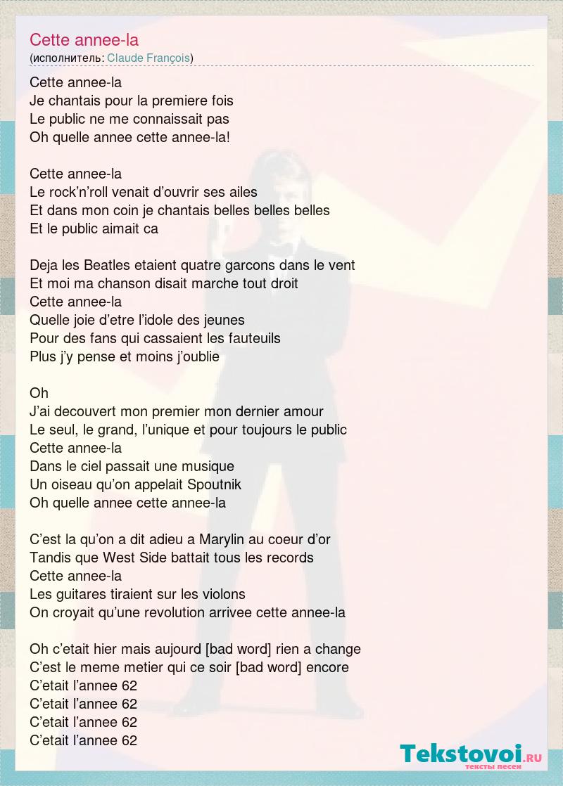 Cette annee-la Je chantais pour la premiere fois Le public ne me connaissait pas Oh quelle annee cette annee-la! Cette annee-la Le rock’n’roll venait d’ouvrir ses ailes Et dans mon coin je chantais belles belles belles Et le public aimait ca Deja les Beatles etaient quatre garcons dans le vent Et moi ma chanson disait marche tout droit Cette annee-la Quelle joie d’etre l’idole des jeunes Pour des fans qui cassaient les fauteuils Plus j’y pense et moins j’oublie Oh J’ai decouvert mon premier mon dernier amour Le seul, le grand, l’unique et pour toujours le public Cette annee-la Dans le ciel passait une musique Un oiseau qu’on appelait Spoutnik Oh quelle annee cette annee-la C’est la qu’on a dit adieu a Marylin au coeur d’or Tandis que West Side battait tous les records Cette annee-la Les guitares tiraient sur les violons On croyait qu’une revolution arrivee cette annee-la Oh c’etait hier mais aujourd [bad word] rien a change C’est le meme metier qui ce soir recommence encore C’etait l’annee 62 C’etait l’annee 62 C’etait l’annee 62 C’etait l’annee 62