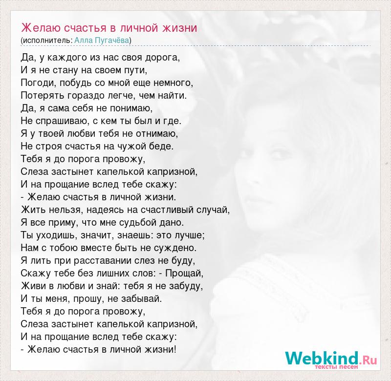 Да, у каждого из нас своя дорога, И я не стану на своем пути, Погоди, побудь со мной еще немного, Потерять гораздо легче, чем найти. Да, я сама себя не понимаю, Не спрашиваю, с кем ты был и где. Я у твоей любви тебя не отнимаю, Не строя счастья на чужой беде. Тебя я до порога провожу, Слеза застынет капелькой капризной, И на прощание вслед тебе скажу: - Желаю счастья в личной жизни. Жить нельзя, надеясь на счастливый случай, Я все приму, что мне судьбой дано. Ты уходишь, значит, знаешь: это лучше; Нам с тобою вместе быть не суждено. Я лить при расставании слез не буду, Скажу тебе без лишних слов: - Прощай, Живи в любви и знай: тебя я не забуду, И ты меня, прошу, не забывай. Тебя я до порога провожу, Слеза застынет капелькой капризной, И на прощание вслед тебе скажу: - Желаю счастья в личной жизни!