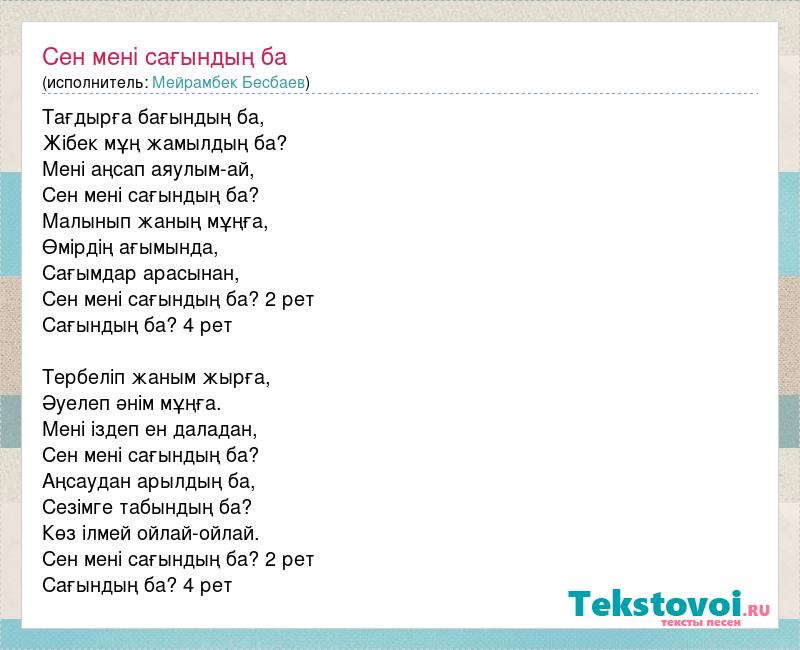 Тағдырға бағындың ба, Жібек мұң жамылдың ба? Мені аңсап аяулым-ай, Сен мені сағындың ба? Малынып жаның мұңға, Өмірдің ағымында, Сағымдар арасынан, Сен мені сағындың ба? 2 рет Сағындың ба? 4 рет Тербеліп жаным жырға, Әуелеп әнім мұңға. Мені іздеп ен даладан, Сен мені сағындың ба? Аңсаудан арылдың ба, Сезімге табындың ба? Көз ілмей ойлай-ойлай. Сен мені сағындың ба? 2 рет Сағындың ба? 4 рет
