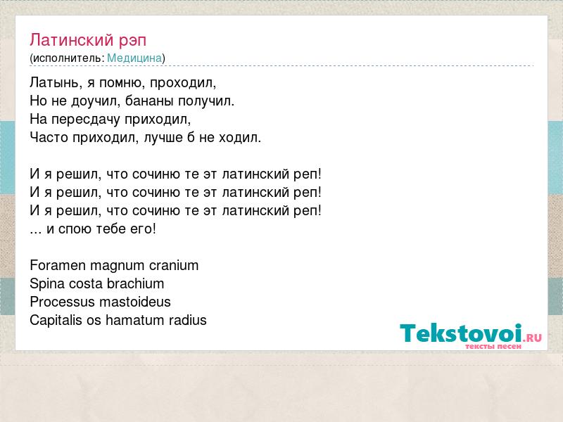 Латынь, я помню, проходил, Но не доучил, бананы получил. На пересдачу приходил, Часто приходил, лучше б не ходил. И я решил, что сочиню те эт латинский реп! И я решил, что сочиню те эт латинский реп! И я решил, что сочиню те эт латинский реп! ... и спою тебе его! Foramen magnum cranium Spina costa brachium Processus mastoideus Capitalis os hamatum radius