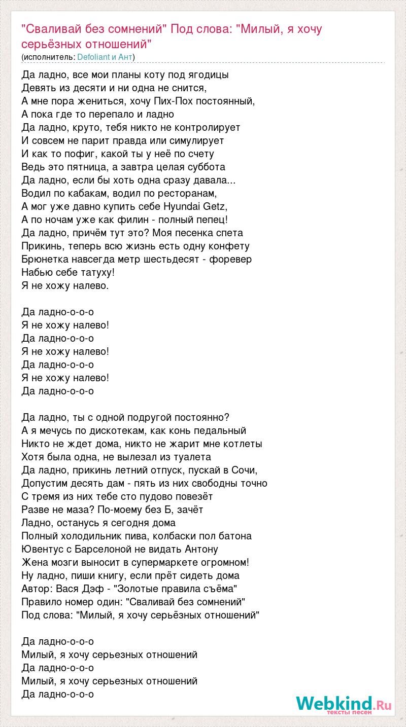 Да ладно, все мои планы коту под ягодицы Девять из десяти и ни одна не снится, А мне пора жениться, хочу Пих-Пох постоянный, А пока где то перепало и ладно Да ладно, круто, тебя никто не контролирует И совсем не парит правда или симулирует И как то пофиг, какой ты у неё по счету Ведь это пятница, а завтра целая суббота Да ладно, если бы хоть одна сразу давала... Водил по кабакам, водил по ресторанам, А мог уже давно купить себе Hyundai Getz, А по ночам уже как филин - полный пепец! Да ладно, причём тут это? Моя песенка спета Прикинь, теперь всю жизнь есть одну конфету Брюнетка навсегда метр шестьдесят - форевер Набью себе татуху! Я не хожу налево. Да ладно-о-о-о Я не хожу налево! Да ладно-о-о-о Я не хожу налево! Да ладно-о-о-о Я не хожу налево! Да ладно-о-о-о Да ладно, ты с одной подругой постоянно? А я мечусь по дискотекам, как конь педальный Никто не ждет дома, никто не жарит мне котлеты Хотя была одна, не вылезал из туалета Да ладно, прикинь летний отпуск, пускай в Сочи, Допустим десять дам - пять из них свободны точно С тремя из них тебе сто пудово повезёт Разве не маза? По-моему без Б, зачёт Ладно, останусь я сегодня дома Полный холодильник пива, колбаски пол батона Ювентус с Барселоной не видать Антону Жена мозги выносит в супермаркете огромном! Ну ладно, пиши книгу, если прёт сидеть дома Автор: Вася Дэф - "Золотые правила съёма" Правило номер один: "Сваливай без сомнений" Под слова: "Милый, я хочу серьёзных отношений" Да ладно-о-о-о Милый, я хочу серьезных отношений Да ладно-о-о-о Милый, я хочу серьезных отношений Да ладно-о-о-о