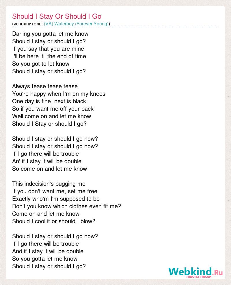 Darling you gotta let me know Should I stay or should I go? If you say that you are mine I'll be here 'til the end of time So you got to let know Should I stay or should I go? Always tease tease tease You're happy when I'm on my knees One day is fine, next is black So if you want me off your back Well come on and let me know Should I Stay or should I go? Should I stay or should I go now? Should I stay or should I go now? If I go there will be trouble An' if I stay it will be double So come on and let me know This indecision's bugging me If you don't want me, set me free Exactly who'm I'm supposed to be Don't you know which clothes even fit me? Come on and let me know Should I cool it or should I blow? Should I stay or should I go now? If I go there will be trouble And if I stay it will be double So you gotta let me know Should I stay or should I go?