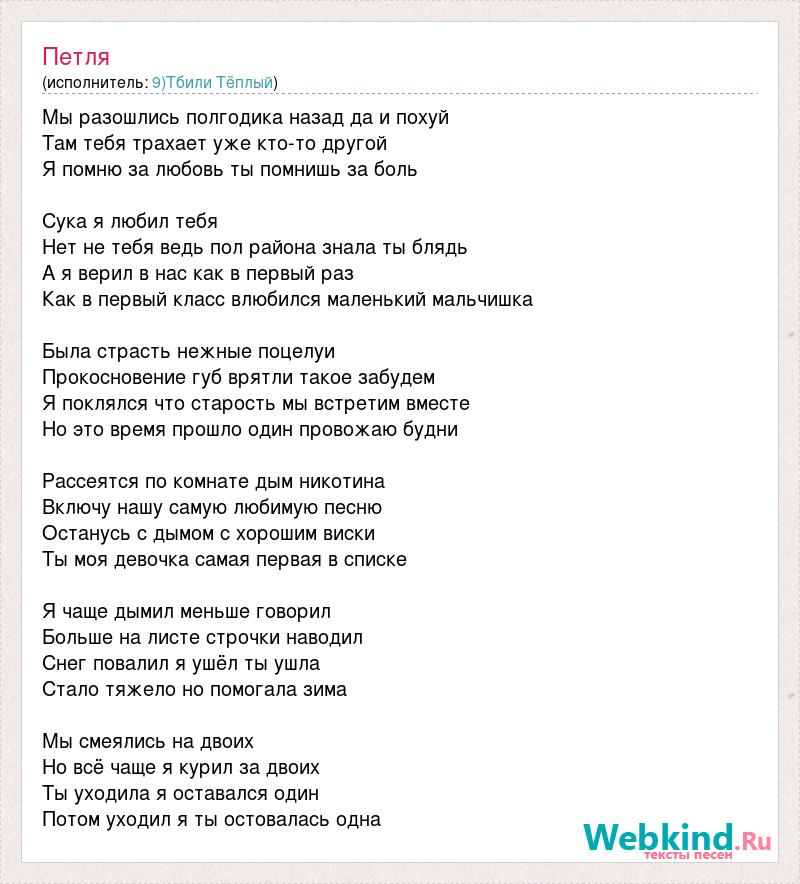 Мы разошлись полгодика назад да и похуй Там тебя трахает уже кто-то другой Я помню за любовь ты помнишь за боль Сука я любил тебя Нет не тебя ведь пол района знала ты блядь А я верил в нас как в первый раз Как в первый класс влюбился маленький мальчишка Была страсть нежные поцелуи Прокосновение губ врятли такое забудем Я поклялся что старость мы встретим вместе Но это время прошло один провожаю будни Рассеятся по комнате дым никотина Включу нашу самую любимую песню Останусь с дымом с хорошим виски Ты моя девочка самая первая в списке Я чаще дымил меньше говорил Больше на листе строчки наводил Снег повалил я ушёл ты ушла Стало тяжело но помогала зима Мы смеялись на двоих Но всё чаще я курил за двоих Ты уходила я оставался один Потом уходил я ты остовалась одна