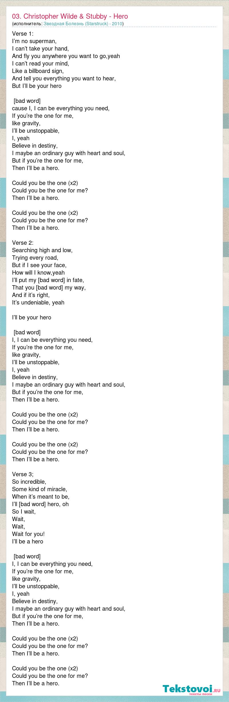 Verse 1: I’m no superman, I can’t take your hand, And fly you anywhere you want to go,yeah I can’t read your mind, Like a billboard sign, And tell you everything you want to hear, But I’ll be your hero [bad word] cause I, I can be everything you need, If you’re the one for me, like gravity, I’ll be unstoppable, I, yeah Believe in destiny, I maybe an ordinary guy with heart and soul, But if you’re the one for me, Then I’ll be a hero. Could you be the one (x2) Could you be the one for me? Then I’ll be a hero. Could you be the one (x2) Could you be the one for me? Then I’ll be a hero. Verse 2: Searching high and low, Trying every road, But if I see your face, How will I know,yeah I’ll put my [bad word] in fate, That you [bad word] my way, And if it’s right, It’s undeniable, yeah I’ll be your hero [bad word] I, I can be everything you need, If you’re the one for me, like gravity, I’ll be unstoppable, I, yeah Believe in destiny, I maybe an ordinary guy with heart and soul, But if you’re the one for me, Then I’ll be a hero. Could you be the one (x2) Could you be the one for me? Then I’ll be a hero. Could you be the one (x2) Could you be the one for me? Then I’ll be a hero. Verse 3; So incredible, Some kind of miracle, When it’s meant to be, I’ll [bad word] hero, oh So I wait, Wait, Wait, Wait for you! I’ll be a hero [bad word] I, I can be everything you need, If you’re the one for me, like gravity, I’ll be unstoppable, I, yeah Believe in destiny, I maybe an ordinary guy with heart and soul, But if you’re the one for me, Then I’ll be a hero. Could you be the one (x2) Could you be the one for me? Then I’ll be a hero. Could you be the one (x2) Could you be the one for me? Then I’ll be a hero.