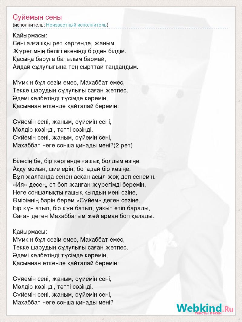 Қайырмасы: Сені алғашқы рет көргенде, жаным, Жүрегімнің бөлігі екеніңді бірден білдім. Қасыңа баруға батылым бармай, Айдай сұлулығыңа тең сырттай таңдандым. Мүмкін бұл сезім емес, Махаббат емес, Текке шарудың сұлулығы саған жетпес. Әдемі келбетіңді түсімде көремін, Қасымнан өткенде қайталай беремін: Сүйемін сені, жаным, сүйемін сені, Мөлдір көзіңді, тәтті сөзіңді. Сүйемін сені, жаным, сүйемін сені, Махаббат неге сонша қинады мені?(2 рет) Білесің бе, бір көргенде ғашық болдым өзіңе. Аққу мойын, шие ерін, ботадай бір көзіңе. Бұл жалғанда сенен асқан асыл жоқ деп сенемін. «Ия» десең, от боп жанған жүрегімді беремін. Неге соншалықты ғашық қылдың мені өзіңе, Өмірімнің бәрін берем «Сүйем» деген сөзіңе. Бір күн атып, бір күн батып, уақыт өтіп барады, Саған деген Махаббатым жәй арман боп қалады. Қайырмасы: Мүмкін бұл сезім емес, Махаббат емес, Текке шарудың сұлулығы саған жетпес. Әдемі келбетіңді түсімде көремін, Қасымнан өткенде қайталай беремін: Сүйемін сені, жаным, сүйемін сені, Мөлдір көзіңді, тәтті сөзіңді. Сүйемін сені, жаным, сүйемін сені, Махаббат неге сонша қинады мені?