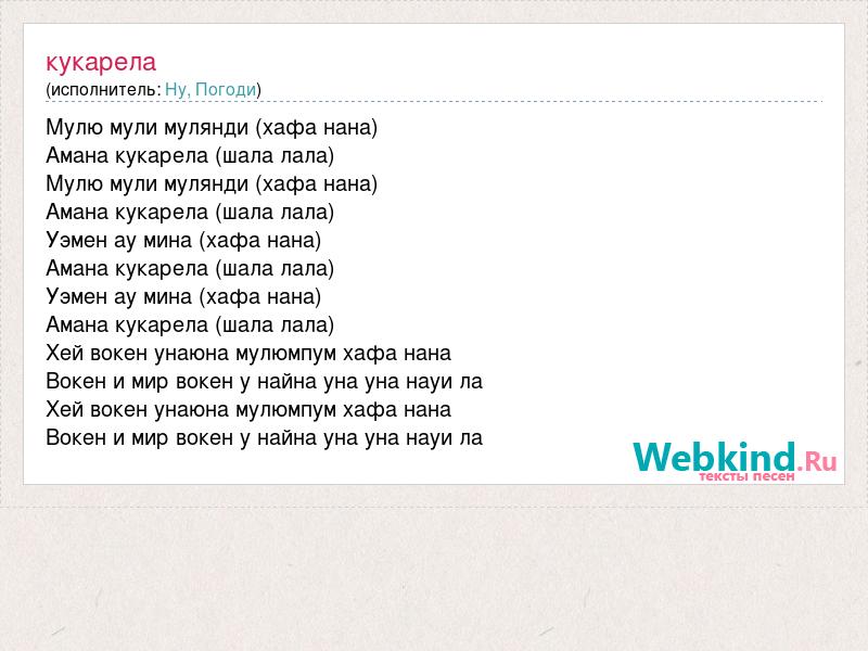 Мулю мули мулянди (хафа нана) Амана кукарела (шала лала) Мулю мули мулянди (хафа нана) Амана кукарела (шала лала) Уэмен ау мина (хафа нана) Амана кукарела (шала лала) Уэмен ау мина (хафа нана) Амана кукарела (шала лала) Хей вокен унаюна мулюмпум хафа нана Вокен и мир вокен у найна уна уна науи ла Хей вокен унаюна мулюмпум хафа нана Вокен и мир вокен у найна уна уна науи ла