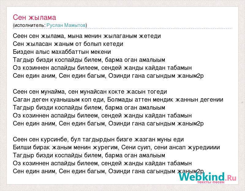 Сеен сен жылама, мына менин жылаганым жетеди Сен жыласан жаным от болып кетеди Бизден алыс махаббаттын мекени Тагдыр бизди коспайды билем, барма оган амалыым Оз козиннен аспайды билеем, сендей жанды кайдан табамын Сен един аним, Сен един багым, Озинди гана сагындым жаным2р Сеен сен мунайма, сен мунайсан кокте жасын тогеди Саган деген куанышым коп еди, Болмады аттен мендик жаннын дегении Тагдыр бизди коспайды билем, барма оган амалыым Оз козиннен аспайды билеем, сендей жанды кайдан табамын Сен един аним, Сен един багым, Озинди гана сагындым жаным2р Сеен сен курсинбе, бул тагдырдын бизге жазган муны еди Билши бирак жаным менин журегим, Сени суип, сени ансап журедииии Тагдыр бизди коспайды билем, барма оган амалыым Оз козиннен аспайды билеем, сендей жанды кайдан табамын Сен един аним, Сен един багым, Озинди гана сагындым жаным2р