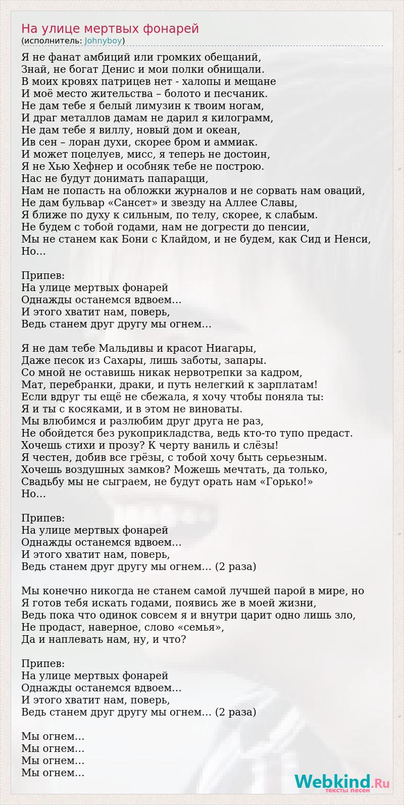 Я не фанат амбиций или громких обещаний, Знай, не богат Денис и мои полки обнищали. В моих кровях патрицев нет - халопы и мещане И моё место жительства – болото и песчаник. Не дам тебе я белый лимузин к твоим ногам, И драг металлов дамам не дарил я килограмм, Не дам тебе я виллу, новый дом и океан, Ив сен – лоран духи, скорее бром и аммиак. И может поцелуев, мисс, я теперь не достоин, Я не Хью Хефнер и особняк тебе не построю. Нас не будут донимать папарацци, Нам не попасть на обложки журналов и не сорвать нам оваций, Не дам бульвар «Сансет» и звезду на Аллее Славы, Я ближе по духу к сильным, по телу, скорее, к слабым. Не будем с тобой годами, нам не догрести до пенсии, Мы не станем как Бони с Клайдом, и не будем, как Сид и Ненси, Но… Припев: На улице мертвых фонарей Однажды останемся вдвоем… И этого хватит нам, поверь, Ведь станем друг другу мы огнем… Я не дам тебе Мальдивы и красот Ниагары, Даже песок из Сахары, лишь заботы, запары. Со мной не оставишь никак нервотрепки за кадром, Мат, перебранки, драки, и путь нелегкий к зарплатам! Если вдруг ты ещё не сбежала, я хочу чтобы поняла ты: Я и ты с косяками, и в этом не виноваты. Мы влюбимся и разлюбим друг друга не раз, Не обойдется без рукоприкладства, ведь кто-то тупо предаст. Хочешь стихи и прозу? К черту ваниль и слёзы! Я честен, добив все грёзы, с тобой хочу быть серьезным. Хочешь воздушных замков? Можешь мечтать, да только, Свадьбу мы не сыграем, не будут орать нам «Горько!» Но… Припев: На улице мертвых фонарей Однажды останемся вдвоем… И этого хватит нам, поверь, Ведь станем друг другу мы огнем… (2 раза) Мы конечно никогда не станем самой лучшей парой в мире, но Я готов тебя искать годами, появись же в моей жизни, Ведь пока что одинок совсем я и внутри царит одно лишь зло, Не продаст, наверное, слово «семья», Да и наплевать нам, ну, и что? Припев: На улице мертвых фонарей Однажды останемся вдвоем… И этого хватит нам, поверь, Ведь станем друг другу мы огнем… (2 раза) Мы огнем… Мы огнем… Мы огнем… Мы огнем…