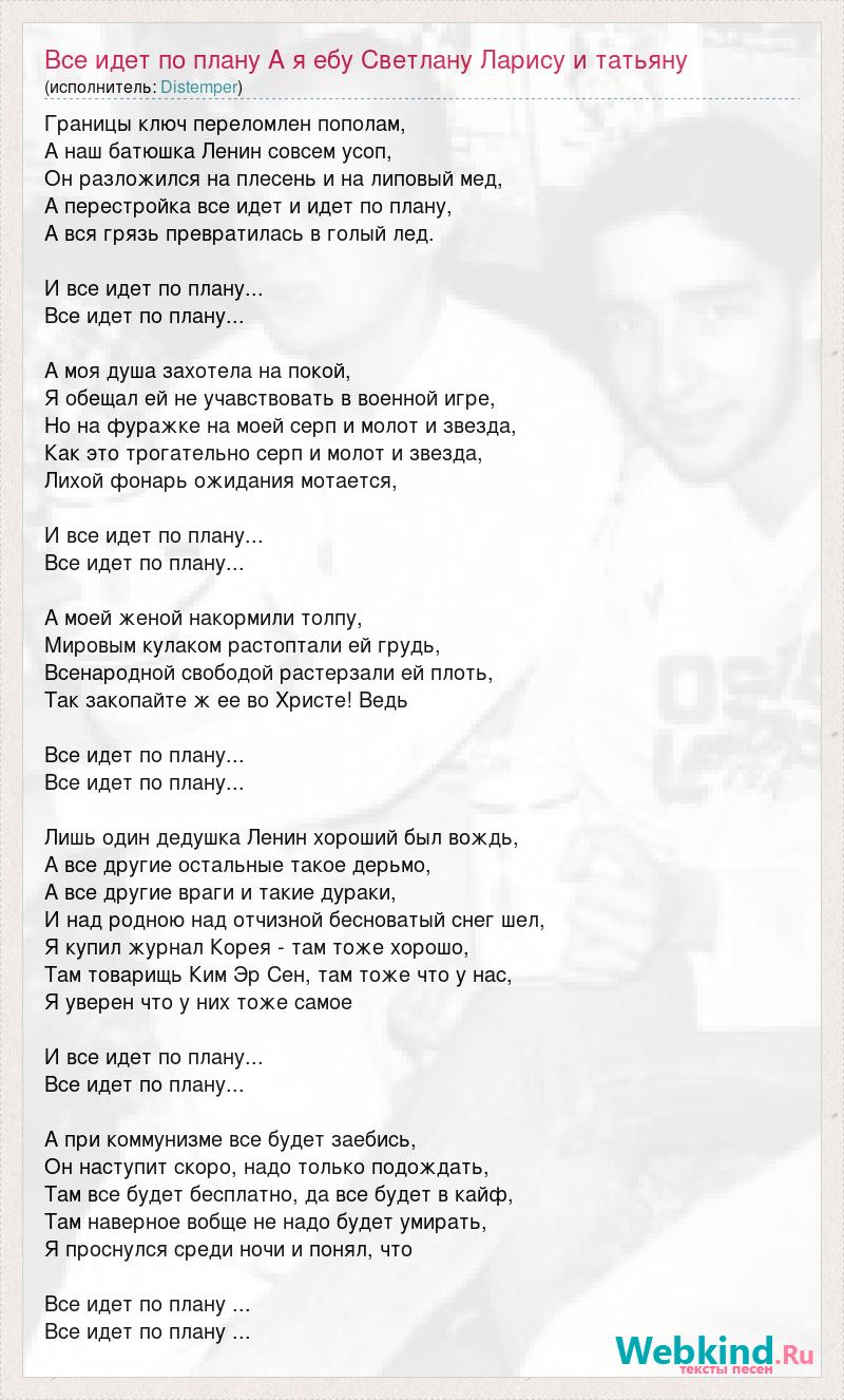 Границы ключ переломлен пополам, А наш батюшка Ленин совсем усоп, Он разложился на плесень и на липовый мед, А перестройка все идет и идет по плану, А вся грязь превратилась в голый лед. И все идет по плану... Все идет по плану... А моя душа захотела на покой, Я обещал ей не учавствовать в военной игре, Но на фуражке на моей серп и молот и звезда, Как это трогательно серп и молот и звезда, Лихой фонарь ожидания мотается, И все идет по плану... Все идет по плану... А моей женой накормили толпу, Мировым кулаком растоптали ей грудь, Всенародной свободой растерзали ей плоть, Так закопайте ж ее во Христе! Ведь Все идет по плану... Все идет по плану... Лишь один дедушка Ленин хороший был вождь, А все другие остальные такое дерьмо, А все другие враги и такие дураки, И над родною над отчизной бесноватый снег шел, Я купил журнал Корея - там тоже хорошо, Там товарищь Ким Эр Сен, там тоже что у нас, Я уверен что у них тоже самое И все идет по плану... Все идет по плану... А при коммунизме все будет заебись, Он наступит скоро, надо только подождать, Там все будет бесплатно, да все будет в кайф, Там наверное вобще не надо будет умирать, Я проснулся среди ночи и понял, что Все идет по плану ... Все идет по плану ...